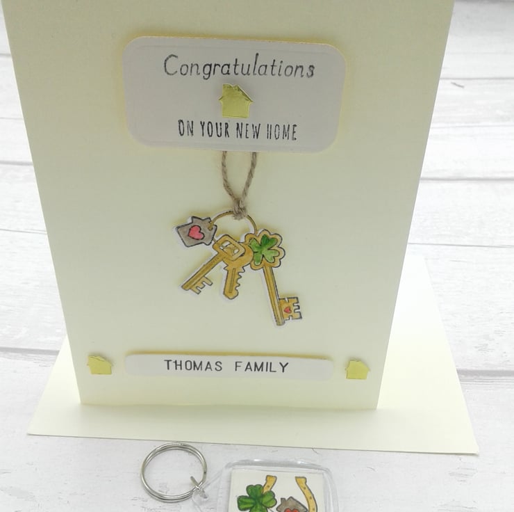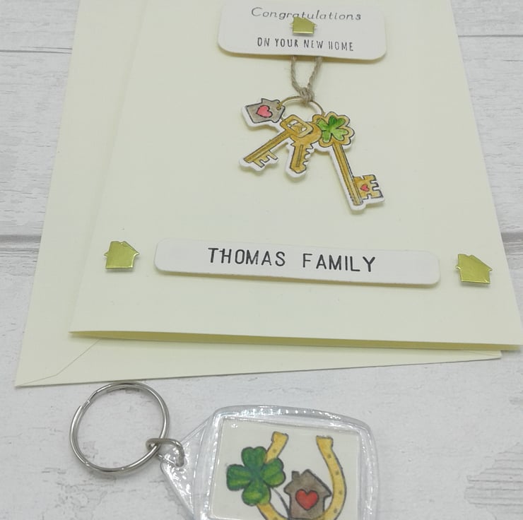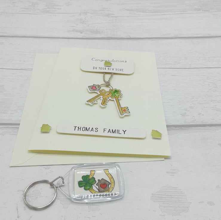 This listing is for a personalised new home card and envelope together with a coordinating personalised keyring.