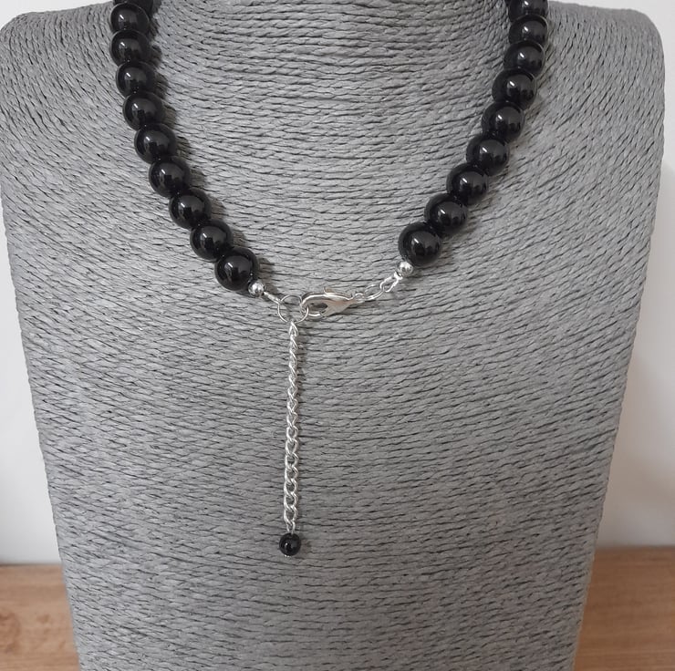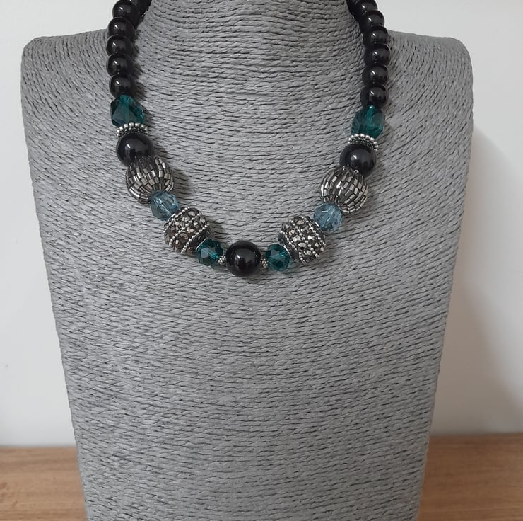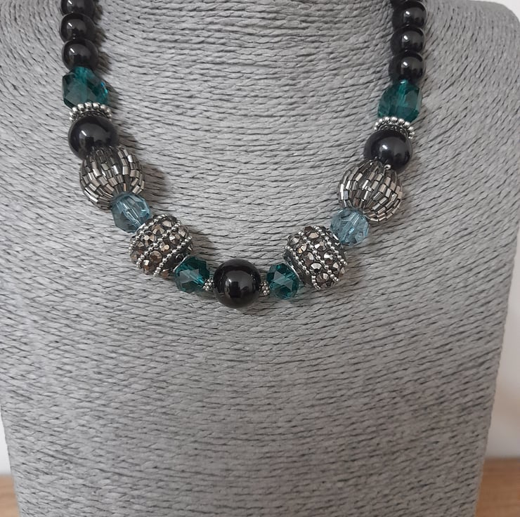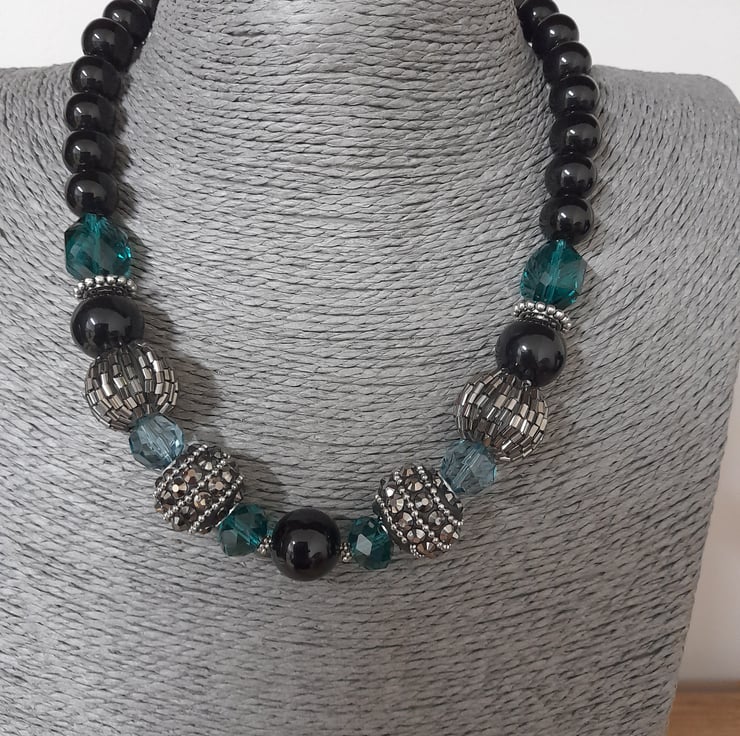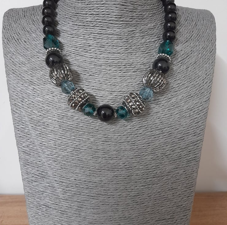 EMERALD GREEN, BLACK AND SILVER STATEMENT NECKLACE.