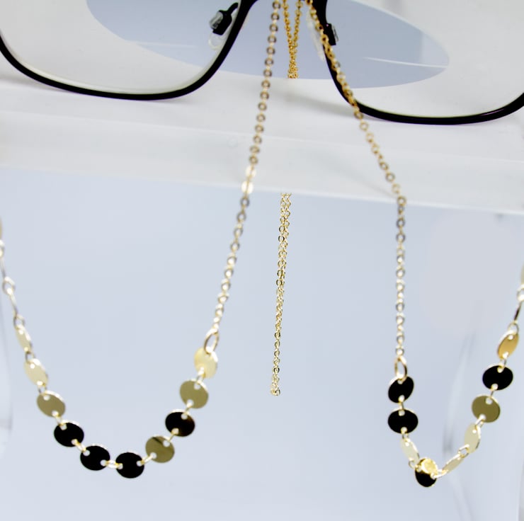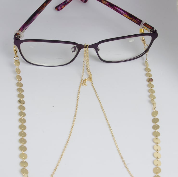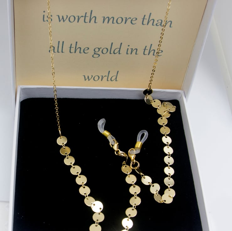 This Uniquely Elegant 3 in 1 Spectacle Holder, Necklace and Lanyard are made of Gold Filled Disk Chain and Gold Filled Trace Chain attached by Lobster Clasps to spectacle holders to prevent loss of your precious eye glasses. The chains look stunning both with the glasses on and off and can be placed with your spectacles in their case, taking up little space.