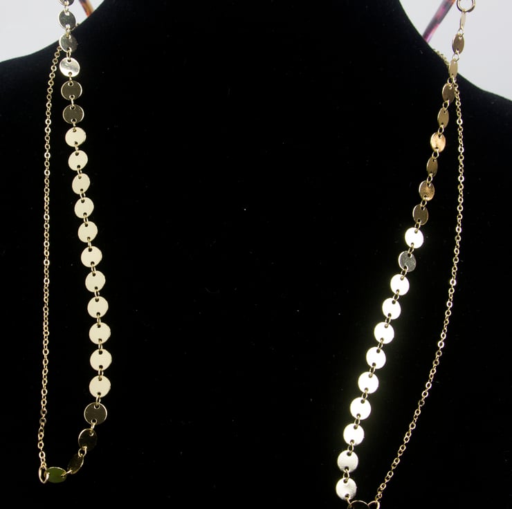 14K Gold Filled 7 mm Disks and 1.8 x 1.6 mm Gold Filled Trace chain.10 mm Lobster Clasps. A pair of Loops stretch rubber loops