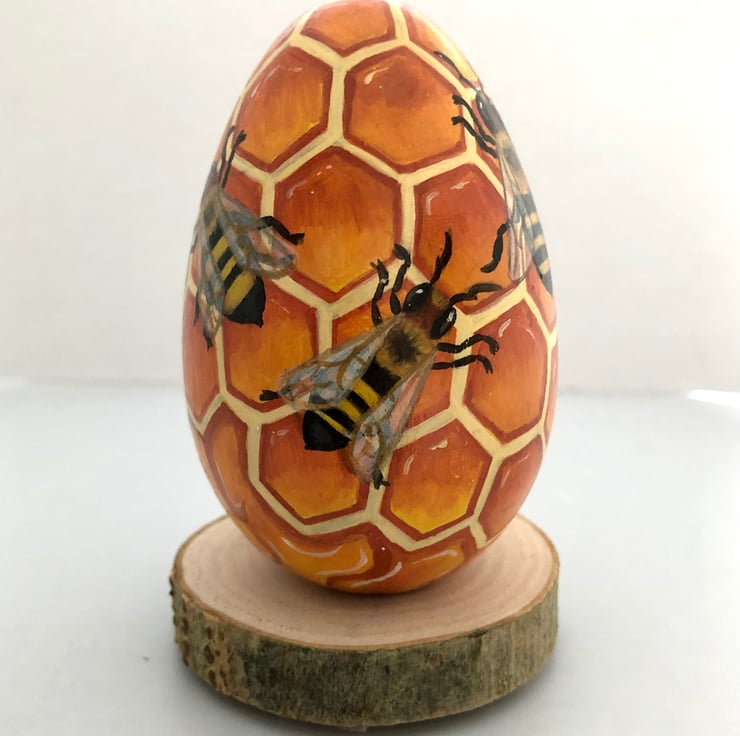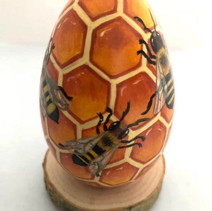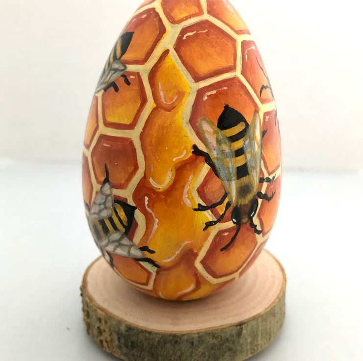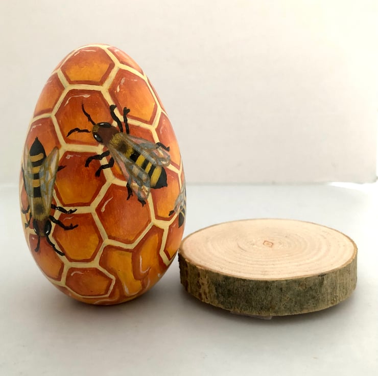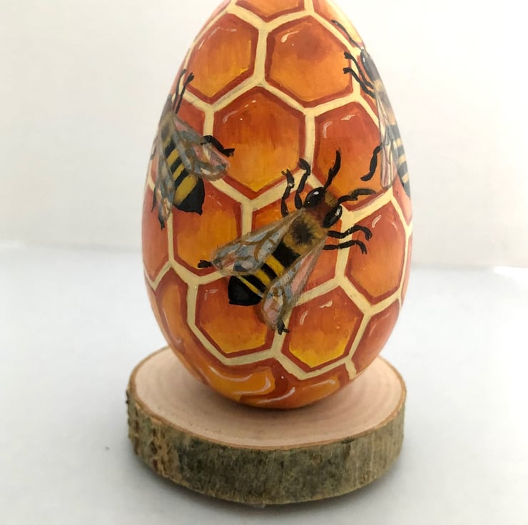 Hand painted on to a solid hard wood egg.