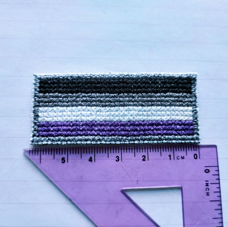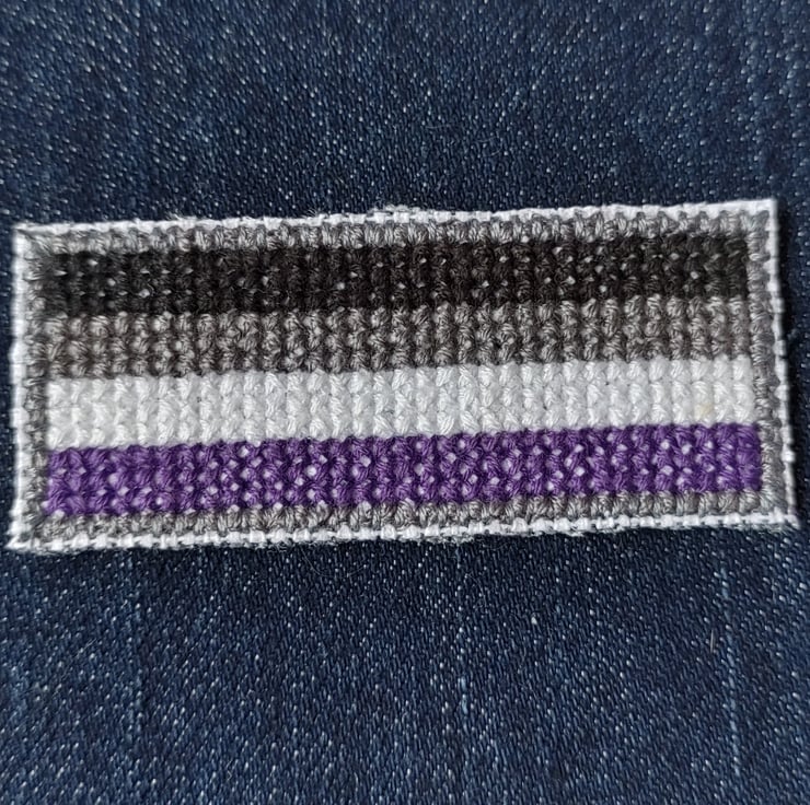 A small cross-stitch patch with scrap denim backing featuring the colours of the asexual pride flag. It measures roughly 6cm x 2.80cm.