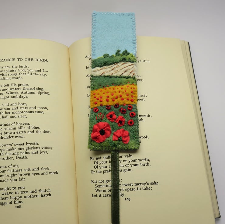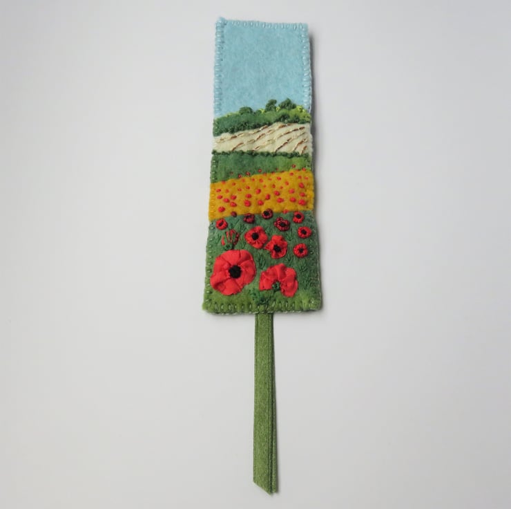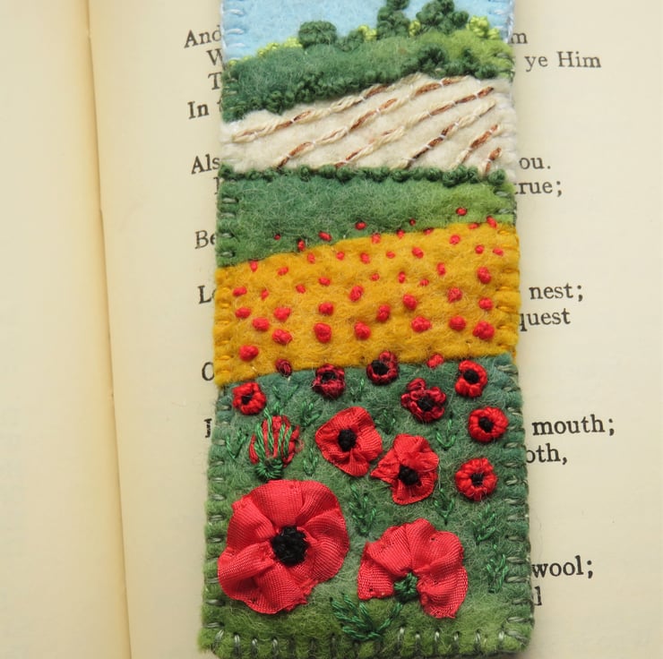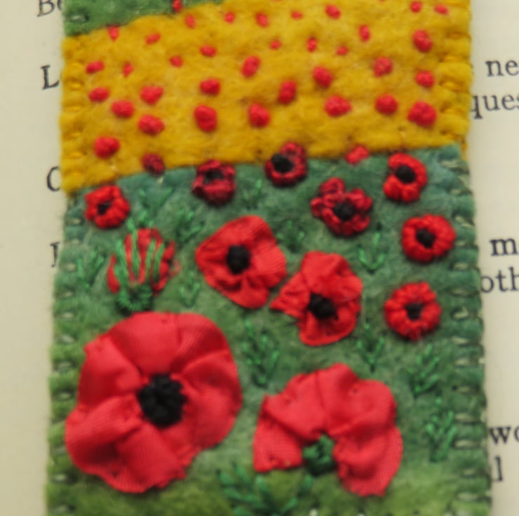 A summer time felt bookmark, featuring bright red silk ribbon poppies.