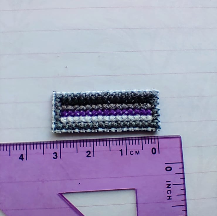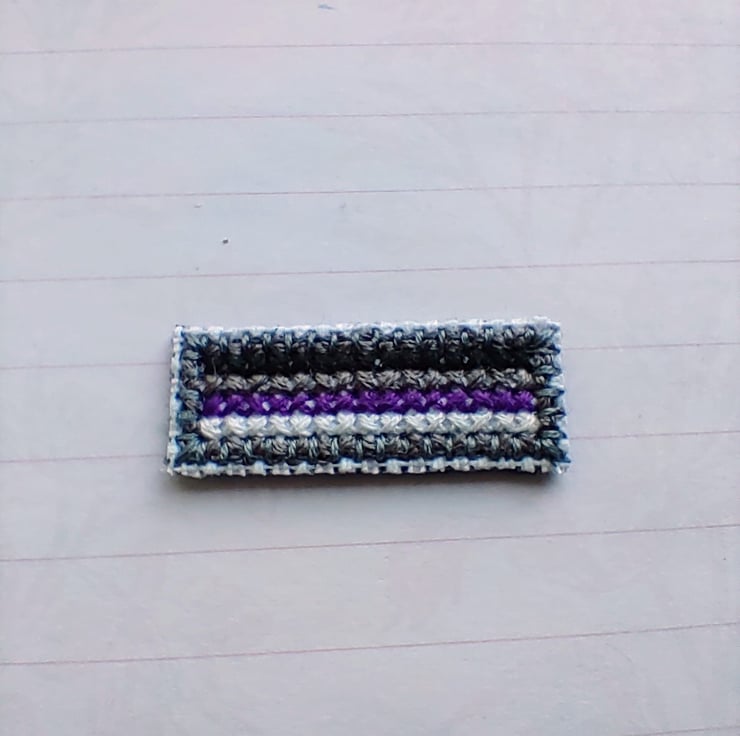 A medium-sized (compared to my other patches!) asexual pride cross-stitch patch with a denim backing to it and machine stitched down for extra security. Due to the nature of the fabrics, some fraying will occur.