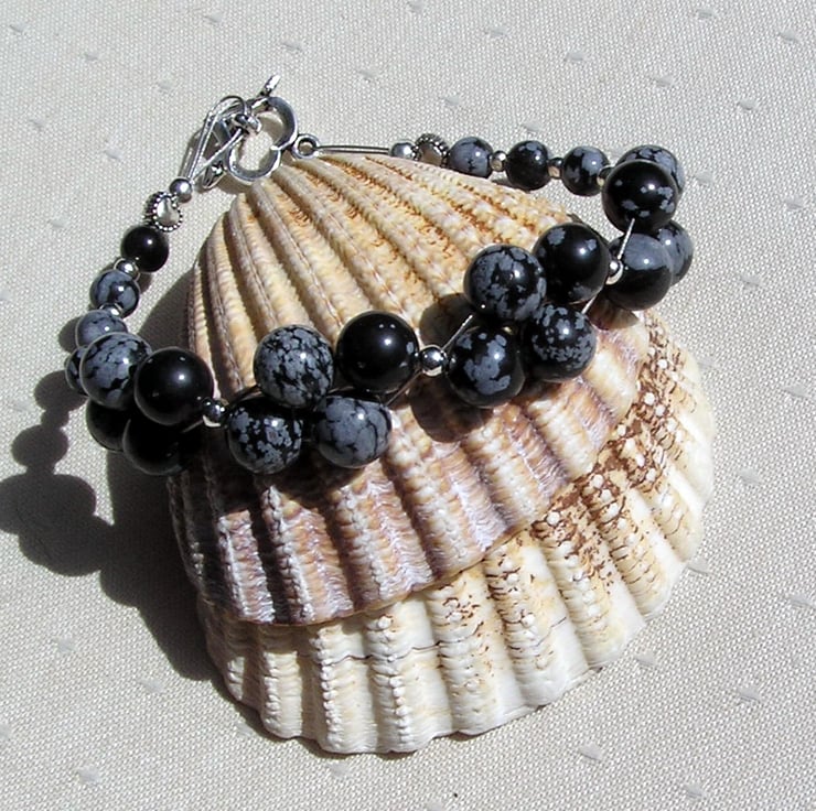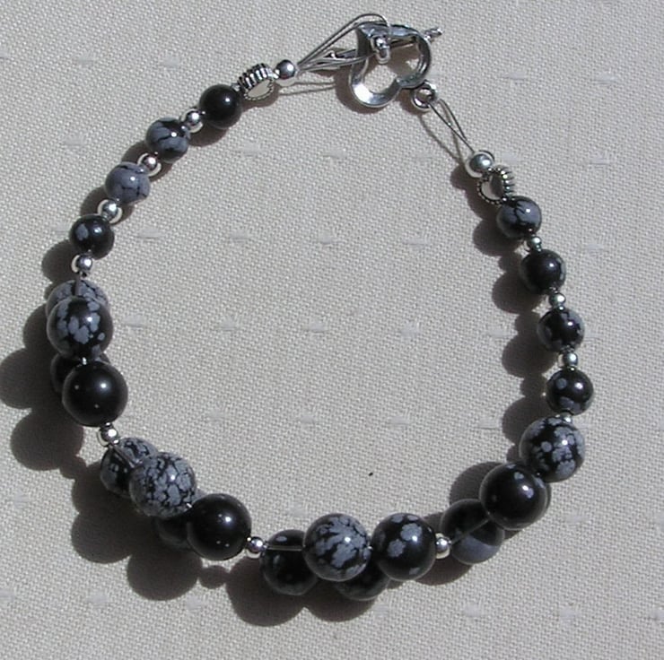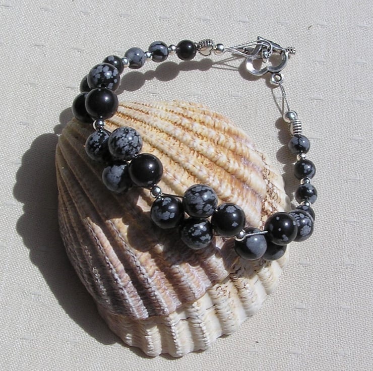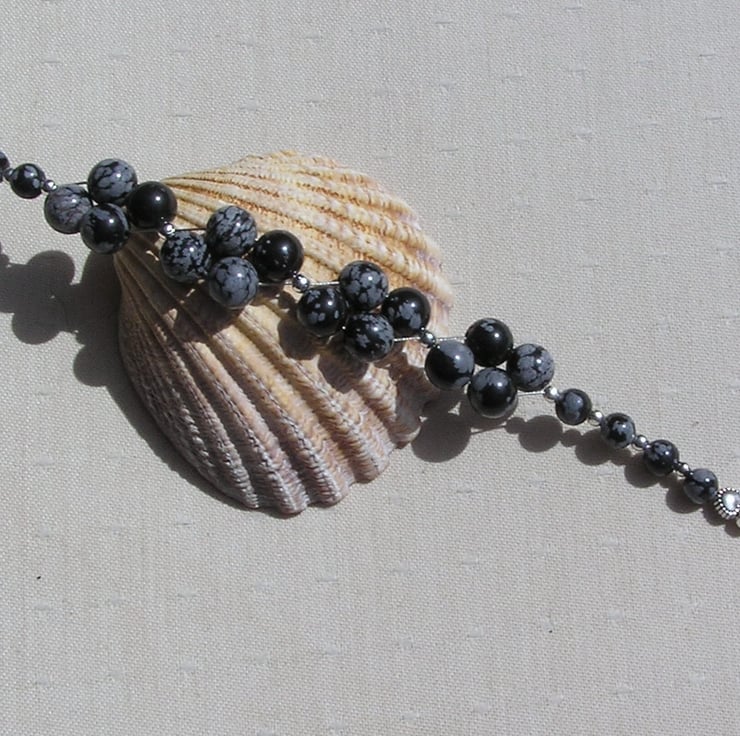 This Stunning Bracelet is made wholly from Snowflake Obsidian round beads clustered together in four's and for that added bit of sparkle tiny Silver spacer beads - A Beautiful combination for either the casual look or wear it with something more Elegant for a Special Evening out