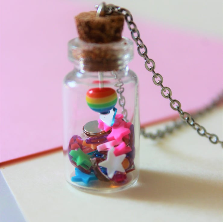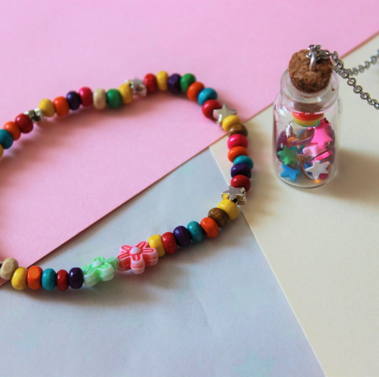 Rainbow beaded bracelet made with wooden seed beads, silver star beads and 2 plastic flower beads. Necklace is made with a small glass bottle with cork lid. Inside the bottle is a mix of coloured large sequins, gems, stars and tiny beads. Attached to the lid is a striped rainbow bead. The cork lid is superglued to the bottle so the bottle wont fall off.