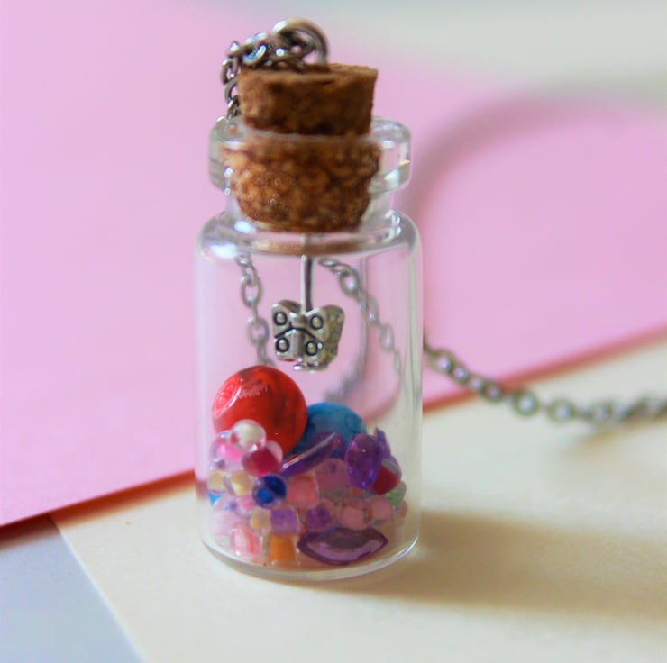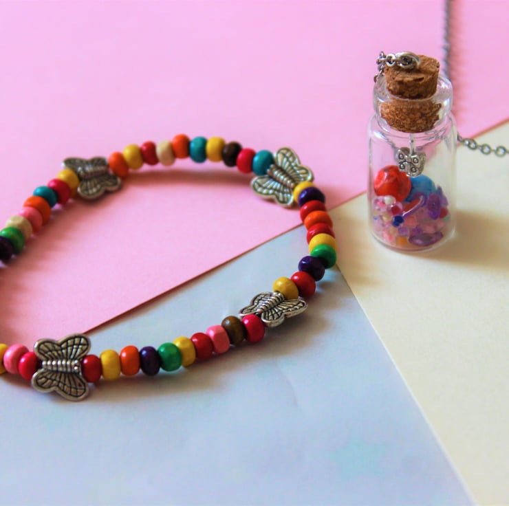 Rainbow beaded bracelet made with wooden seed beads and large silver butterfly beads. The necklace is made with a small glass bottle with cork lid. Inside is tiny beads, lilac gems and a red and blue bead. Hanging from the lid is a tiny silver butterfly. The lid is superglued to the bottle so it wont fall off.