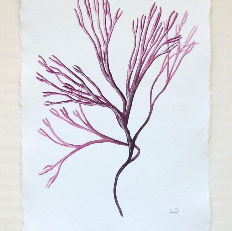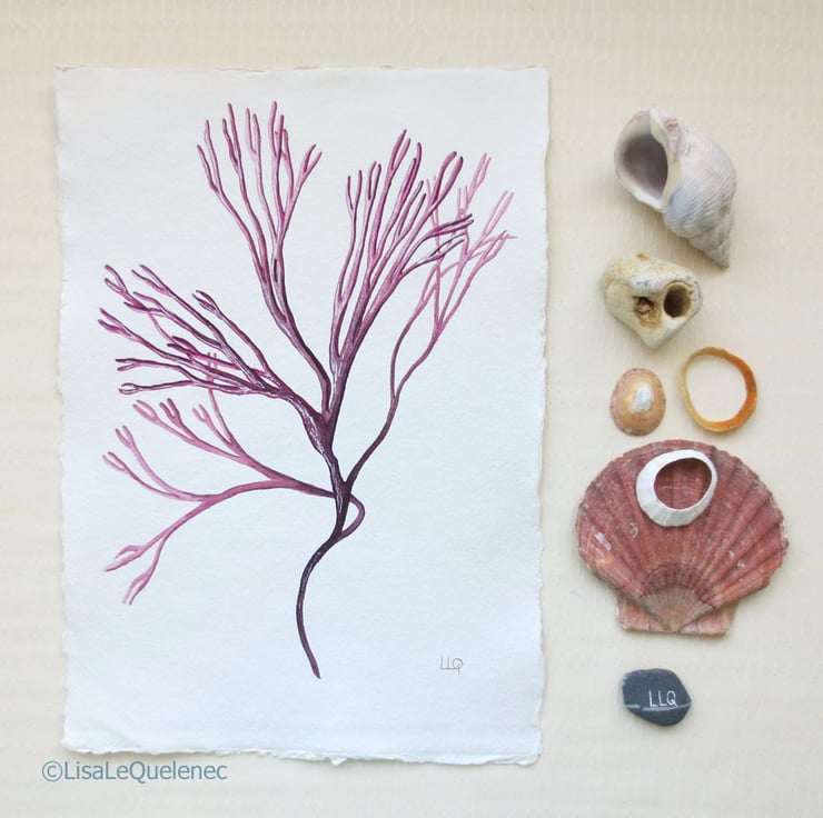 An original watercolour painting of pink seaweed, a little treasure from the ocean. Painted in artists quality watercolour on a beautiful piece of deckle edged textured paper. The size is approximately 21x30cm or 8x12inch (approx size due to the uneven deckle edge). The painting is signed in pencil in the lower right corner and is ready to ship.