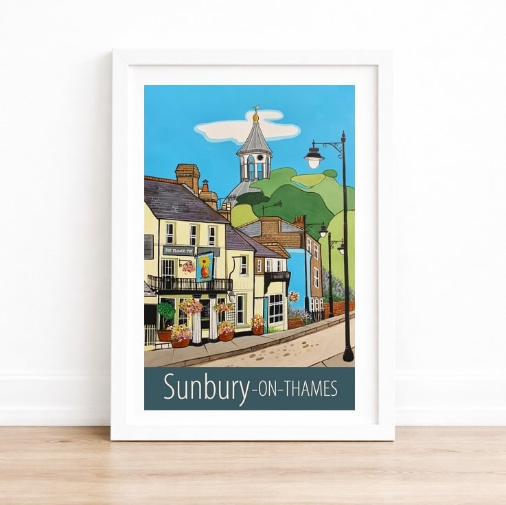 A contemporary travel poster style print of Sunbury-on-Thames, from my own original acrylic painting. A perfect gift for those who love Sunbury!