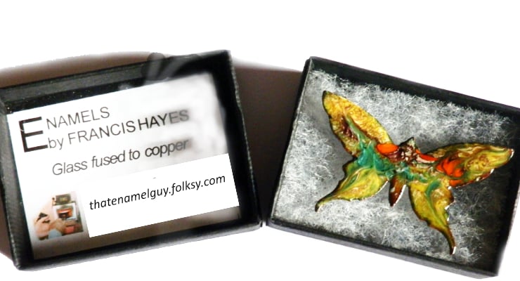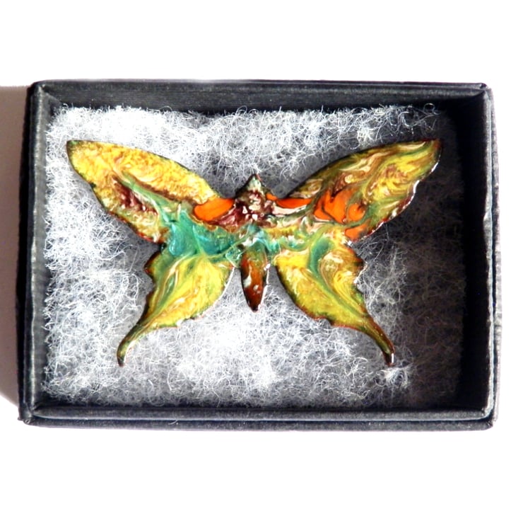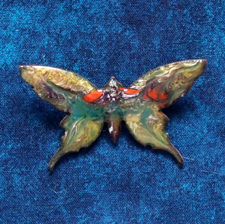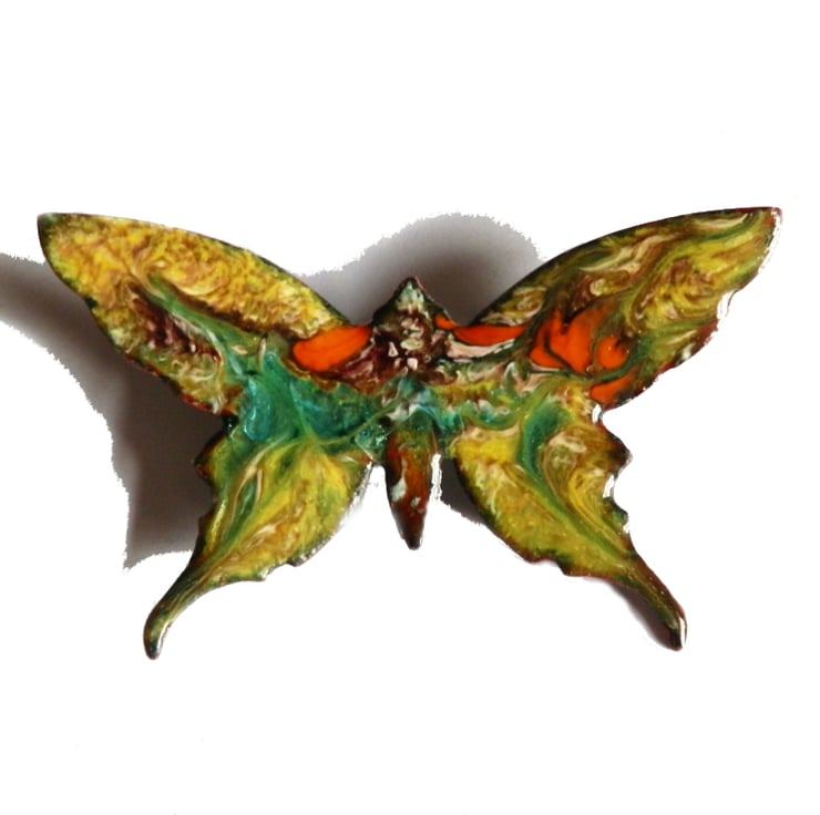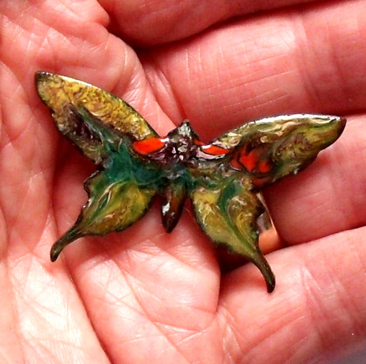 The majority of my work involves using the malleability of the glass enamel to decorate the copper blanks I use. The results are wholly unpredictable. Sooner or later the enamel will cool to a point at which I can no longer manipulate it, leaving me with a pattern of swirls and textures determined by the material. The butterfly shape lends itself particularly to this technique. The final result is a compromise between my aspirations and the impracticability of reworking the piece. Few pieces are lost entirely. There are many more possibilities lurking in the kiln.