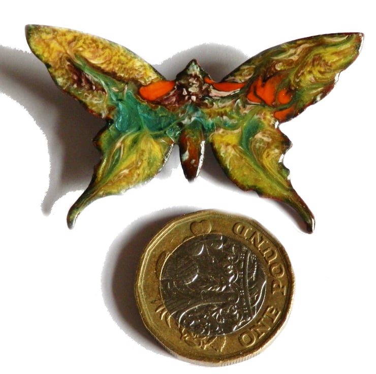 The butterfly measures 48mm from tip to tip of its upper wings, 28mm from the tip of the upper wings to the tip of the lower pair. I have soldered a 26mm brooch bar to the reverse of the butterfly. The brooch pin secures with a rotating catch.