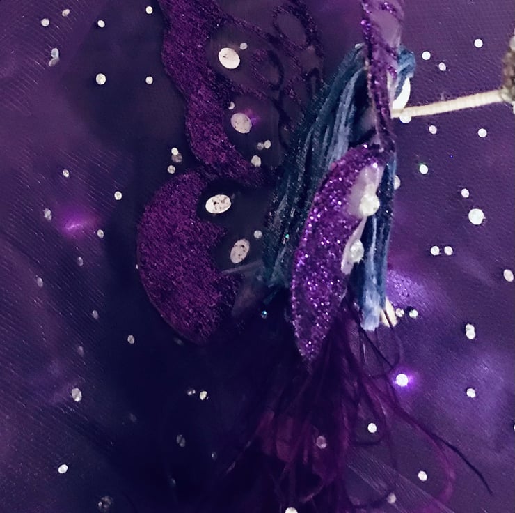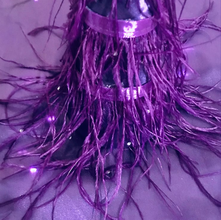 Her dress is made with purple satin and purple ostrich feathers along with faux clear gems. This I think gives the impression of falling rain. What do you think?