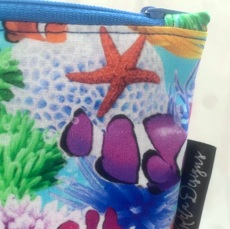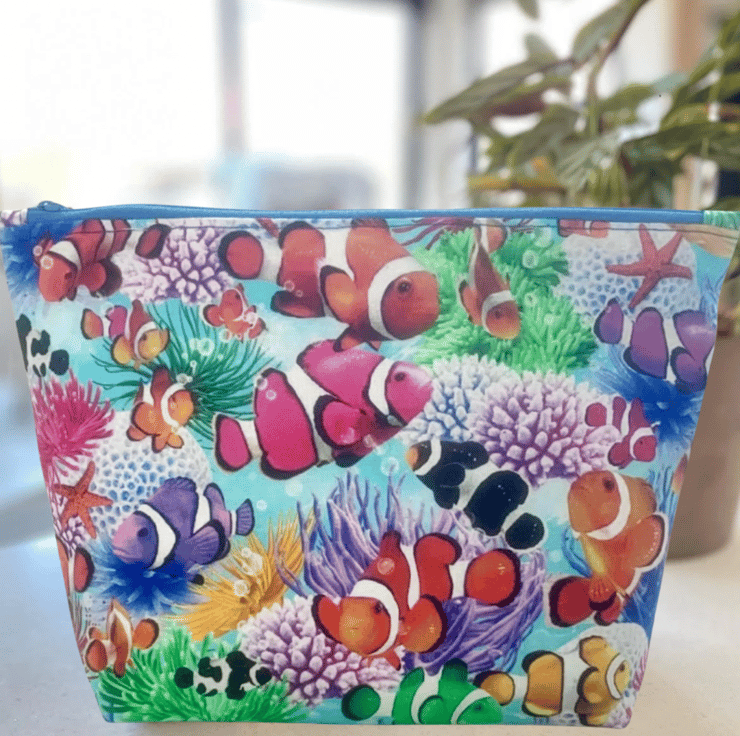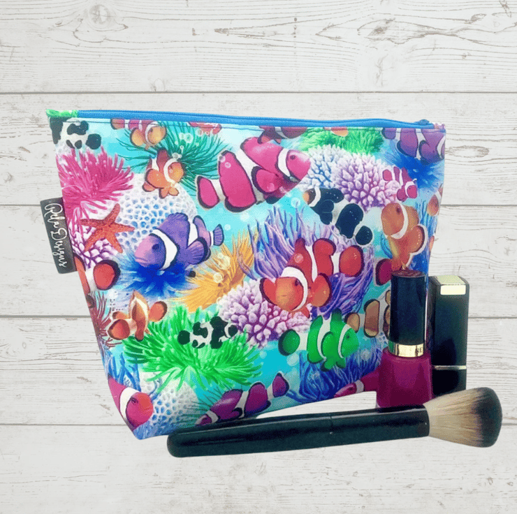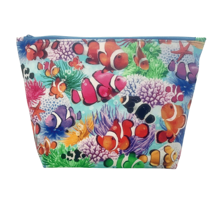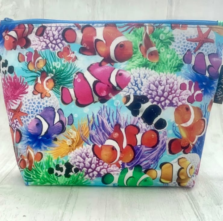 This colourful fish print cotton large zipped pouch has a bright blue waterproof nylon lining , great for those inevitable spills.