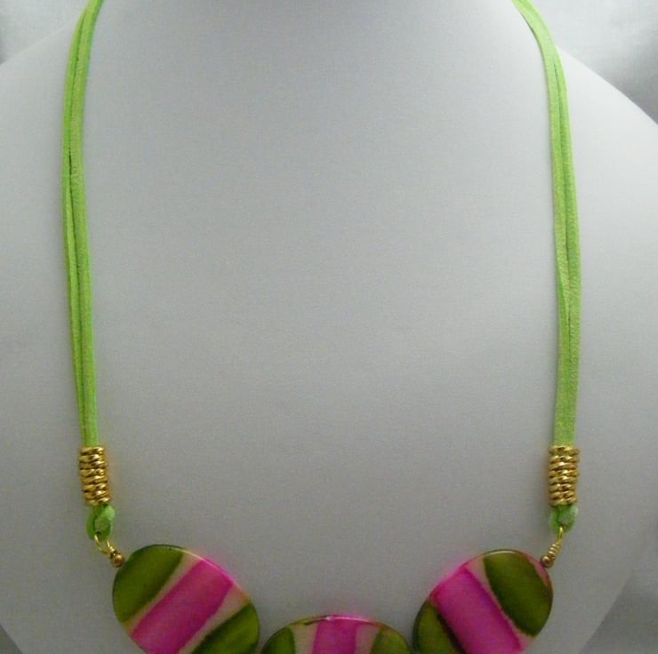 Necklace is handmade with, 35x25mm fuchsia and lime oval shell beads, 2mm gold plated spacer beads, gold plated patterned jump rings, lime green suedette, gold plated wire, and gold pated findings. Clasp is handmade.