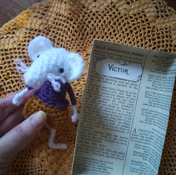 Your mouse comes in a little display box with their name. The box is lined with a page from an 1895 book. If you look closely you will find the inspiration for your mouses name and a little story.