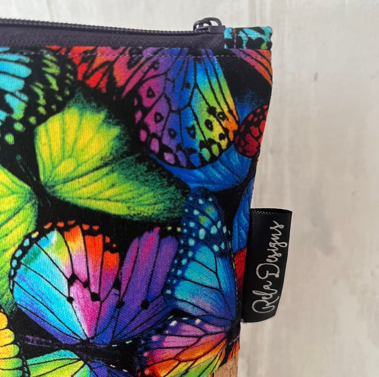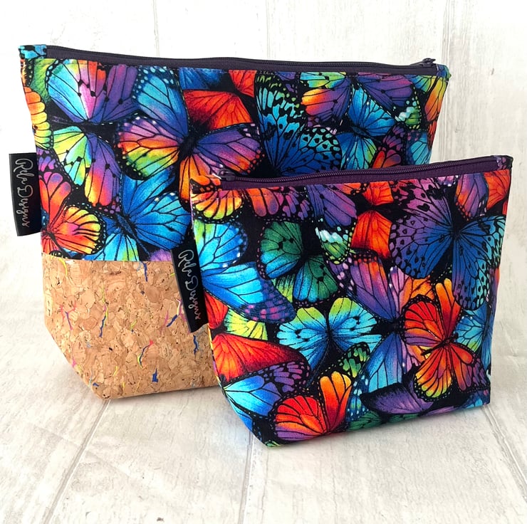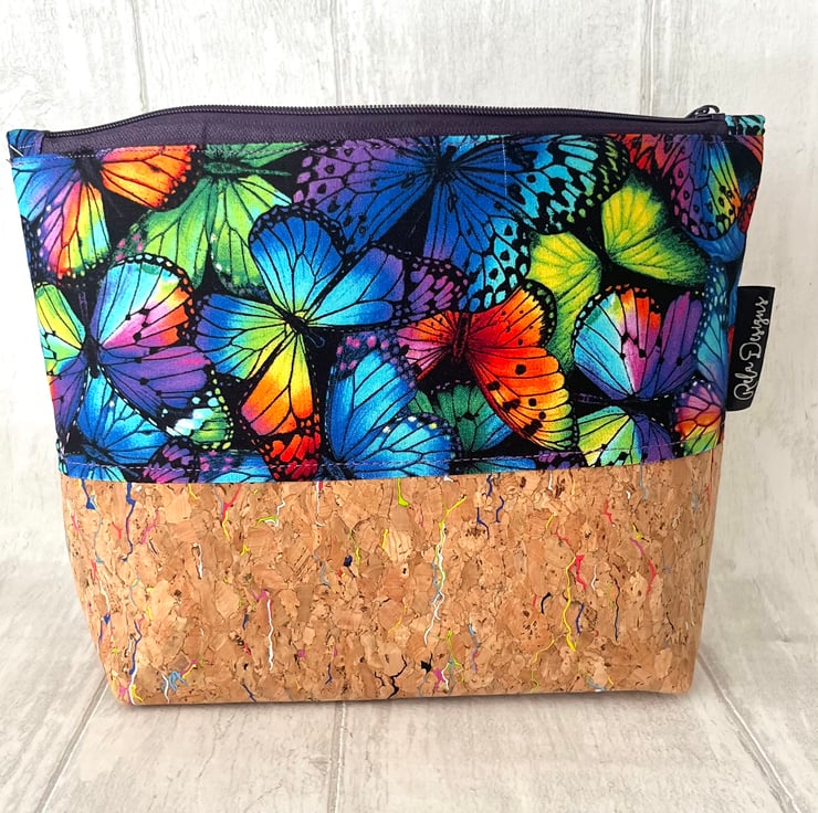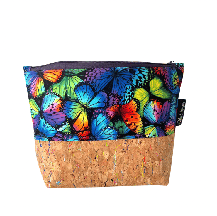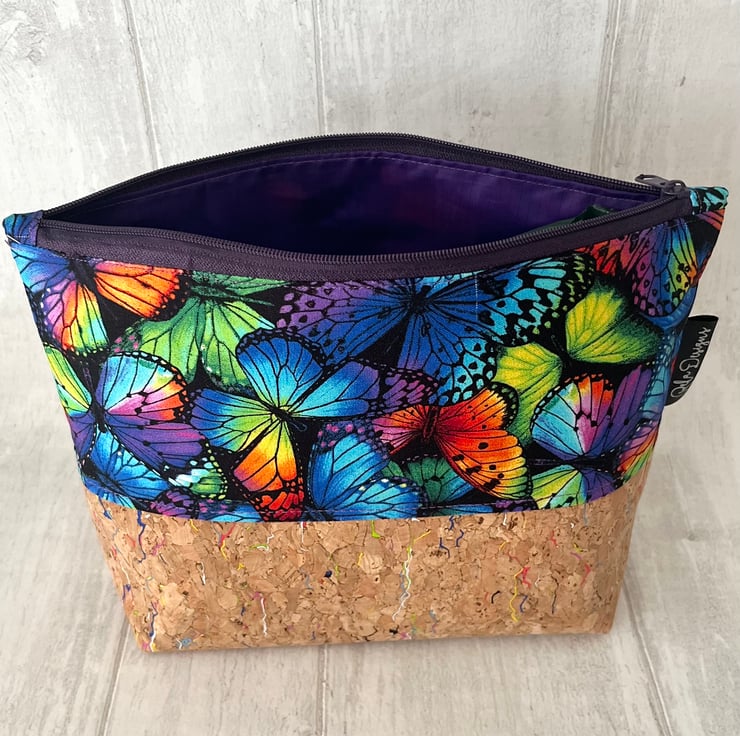 This 100% cotton bright butterfly print and cork base large make up bag has a purple waterproof nylon lining , great for those inevitable spills.