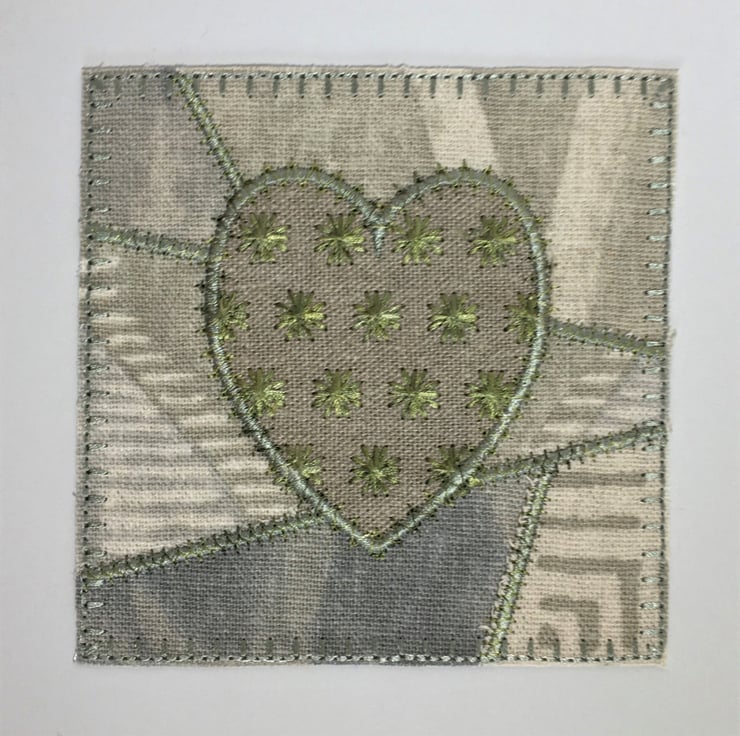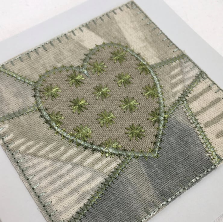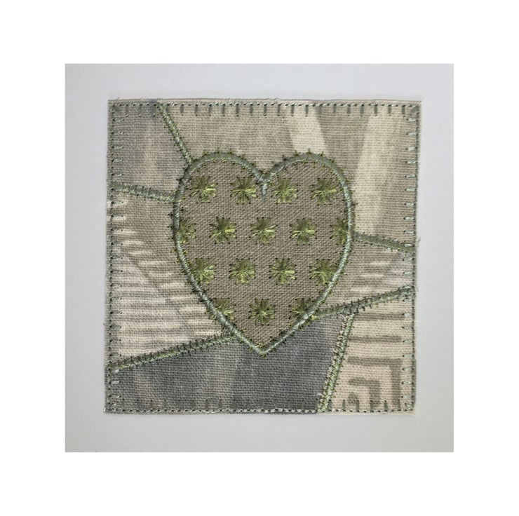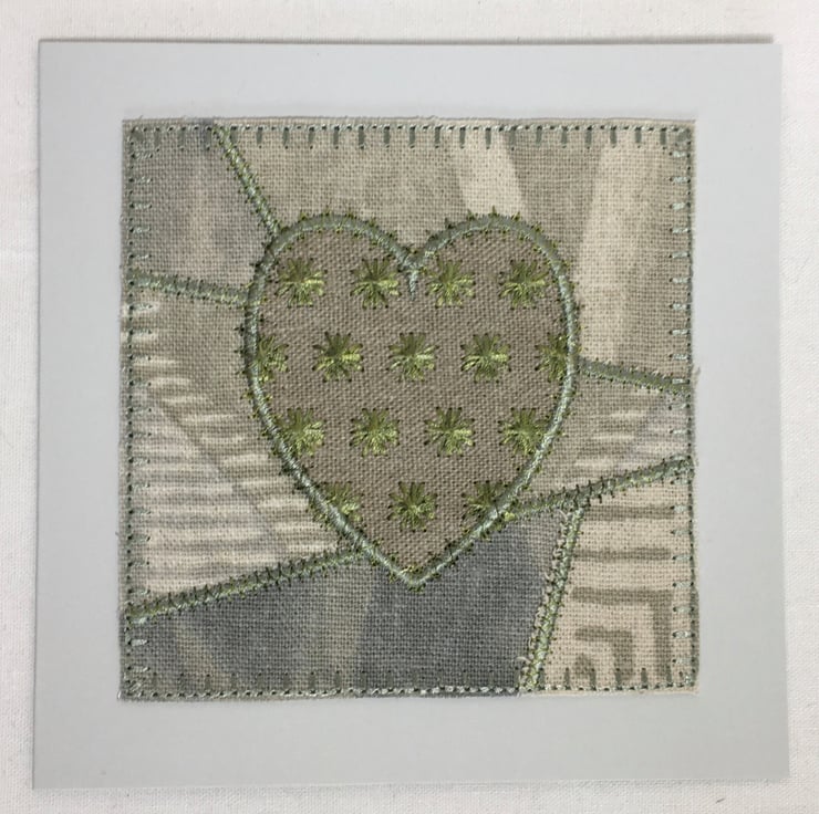 This is a hand crafted machine embroidered crazy patchwork textile card featuring a heart of textured Linen applique. The heart has soft Sage Green embroidered stars within it and the whole textile section is mounted on a pale Grey card.