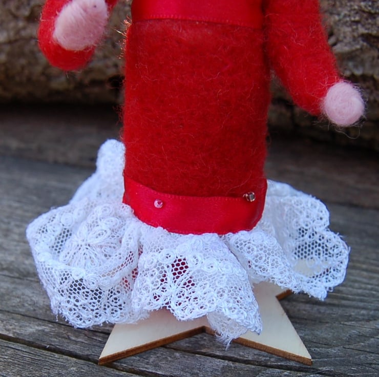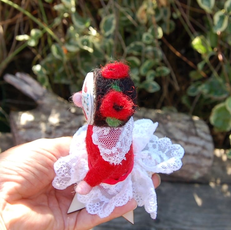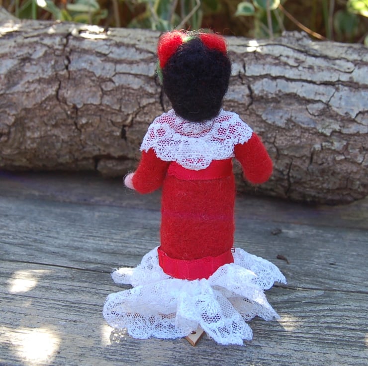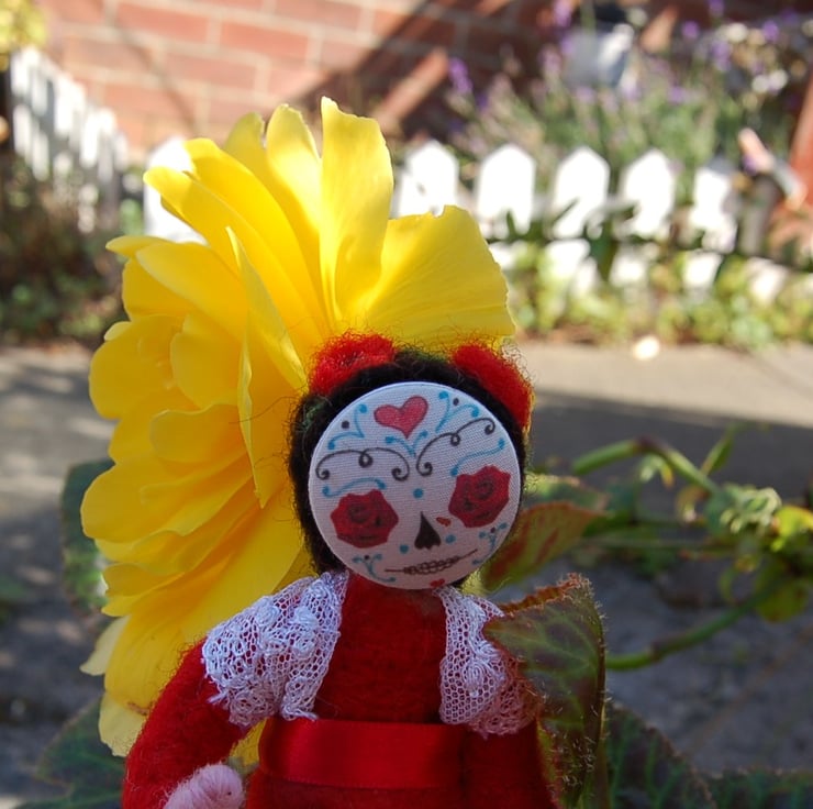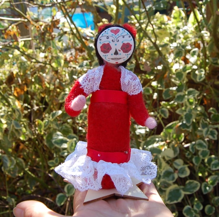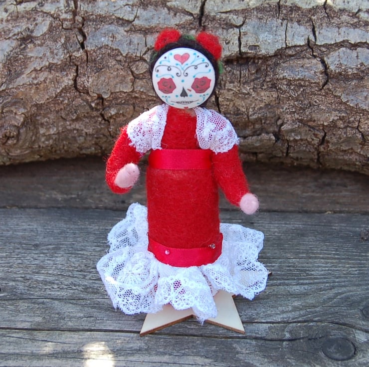 Her body is made from wool core needle felted into a shape. Soft unspun wool fibre with a has been lightly needle felted for her dress. I've given her black hair made from dyed wool locks. Her sugar skull mask is a large button. Beads are sewn onto her dress. Glued onto a star shaped wood slice for stability.