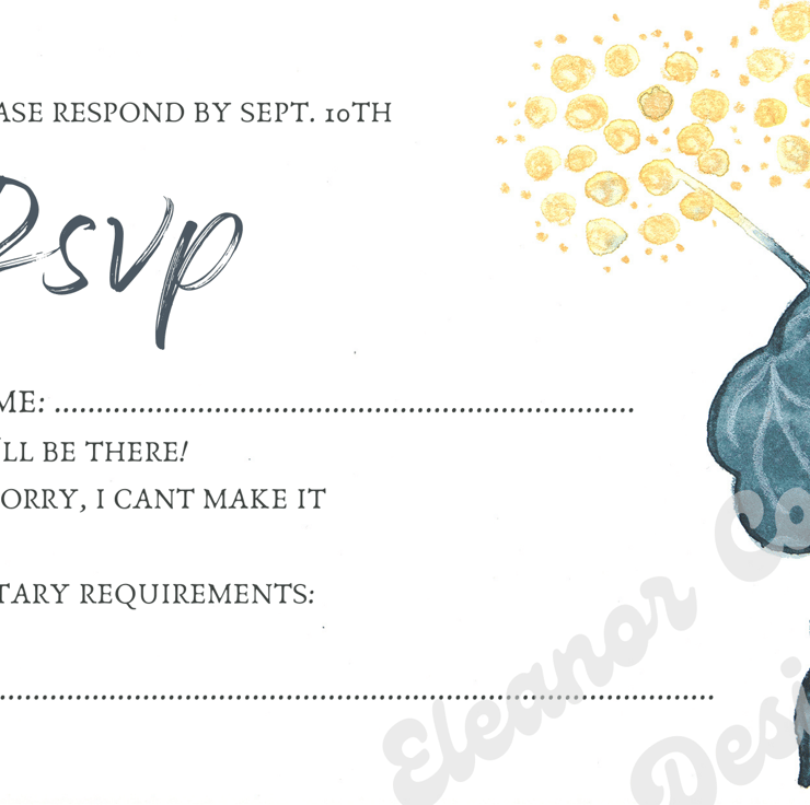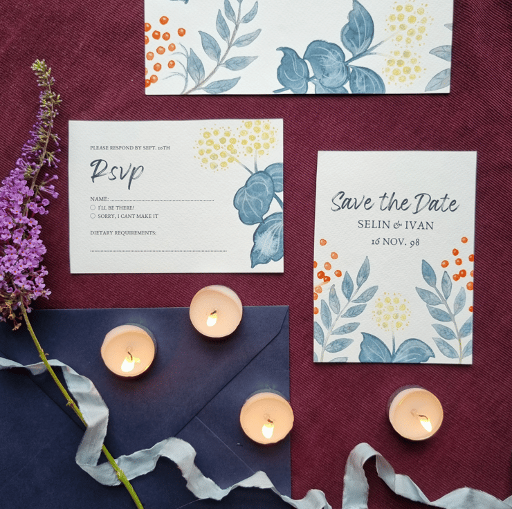 - if its a save the date or RSVP please specify an envelope colour (dark green or dark blue). I’ll send you the finished item to approve: at this point you can request any changes.