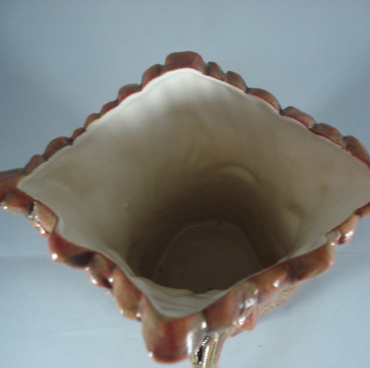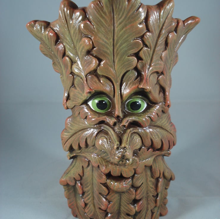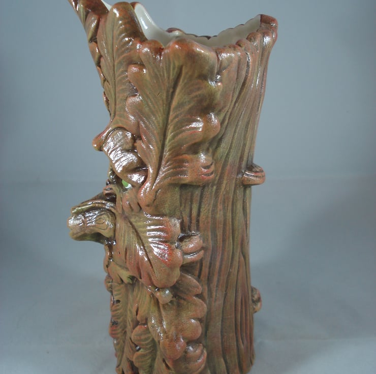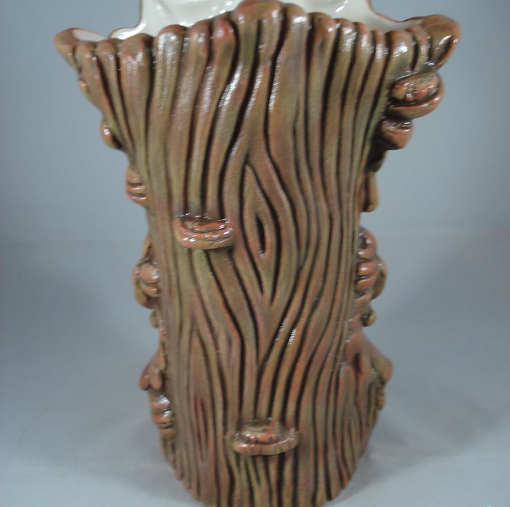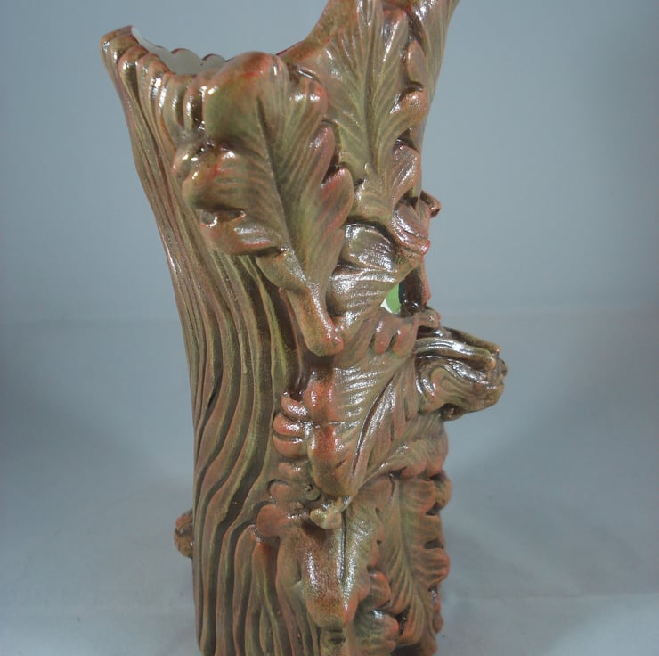 I have for sale a ceramic novelty vase, which was hand painted by myself. It looks like a tree trunk on the back of the vase, with leaves and a cute looking face on the front. This item has been clear glazed inside. This would make a lovely addition to anyone's home, or perhaps given as a gift.