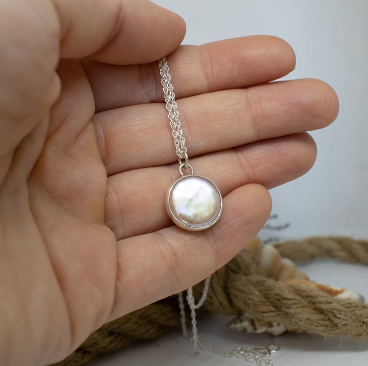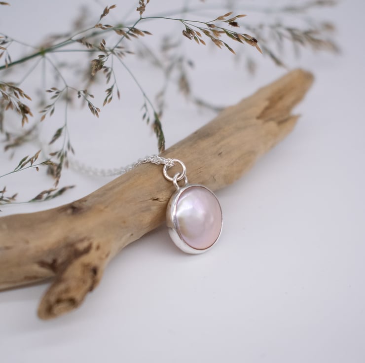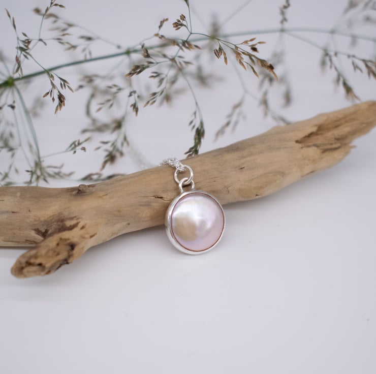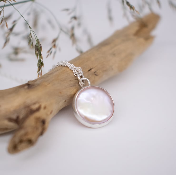 The classic pearl pendant with a contemporary twist. A single freshwater coin pearl in a subtle pink tone is set in a sterling silver surround. Hung from a Prince of Wales style chain in your choice of length, this timeless design would make a beautiful bridal piece or gift for bridesmaids.