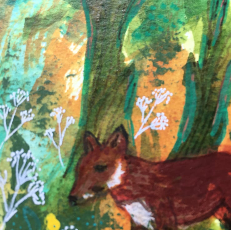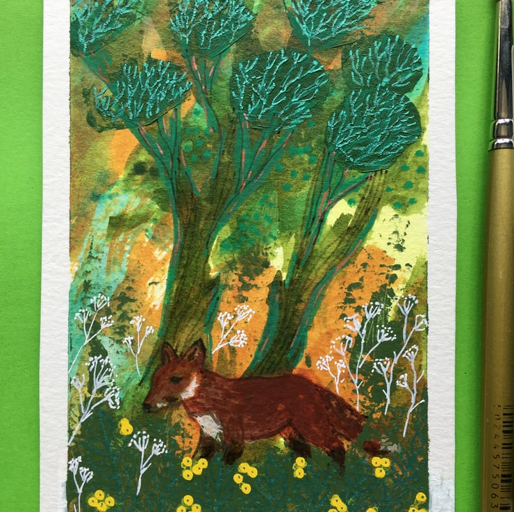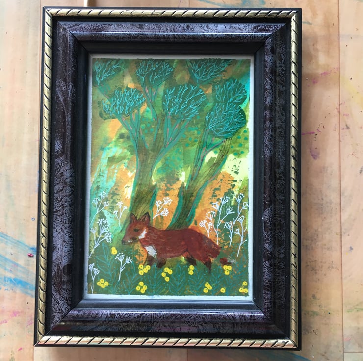 Original acrylic with a watercolour background on paper, in a whimsical style featuring a fox in a colourful landscape. It measures approx 12.5cm x 9cm and will fit a shop bought frame, (the frame in the photo is not for sale) so makes an ideal gift. Postage is free to UK destinations and it will be sent in a cello bag within a sturdy envelope.