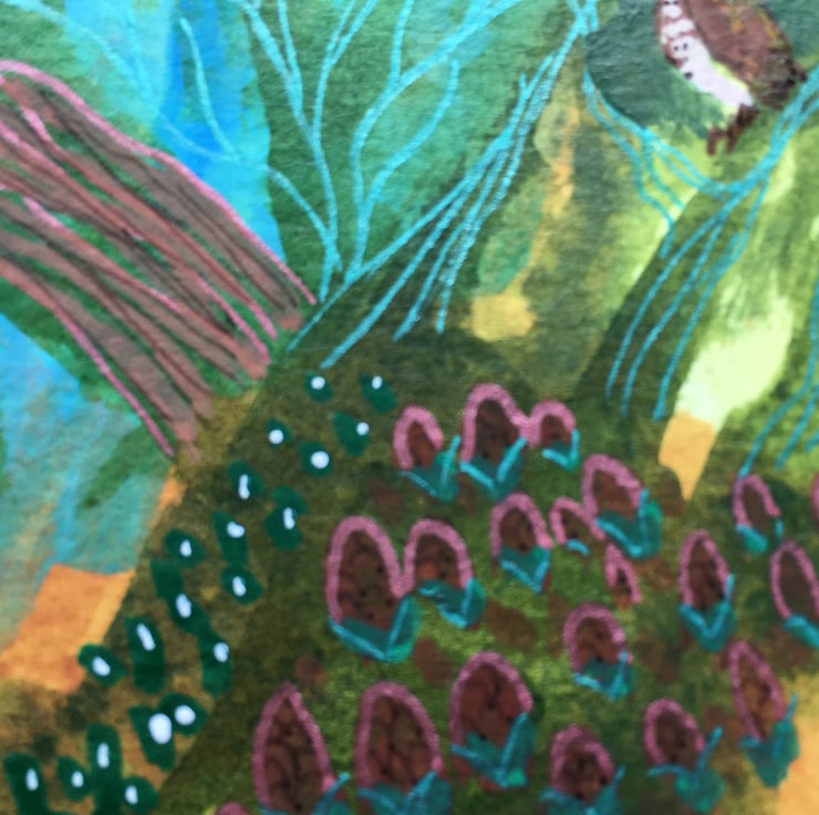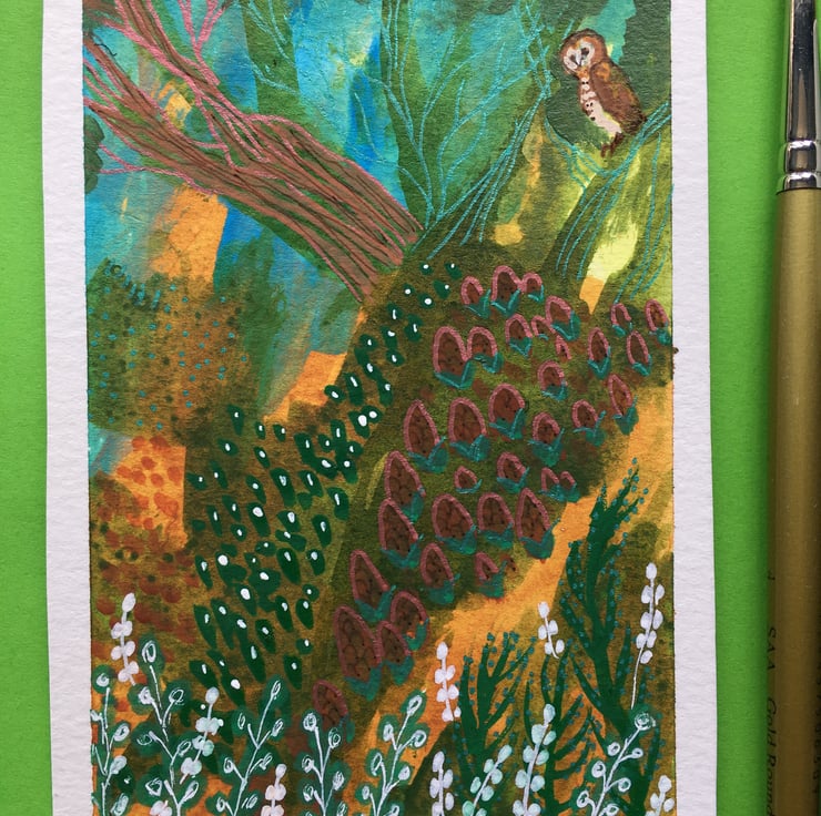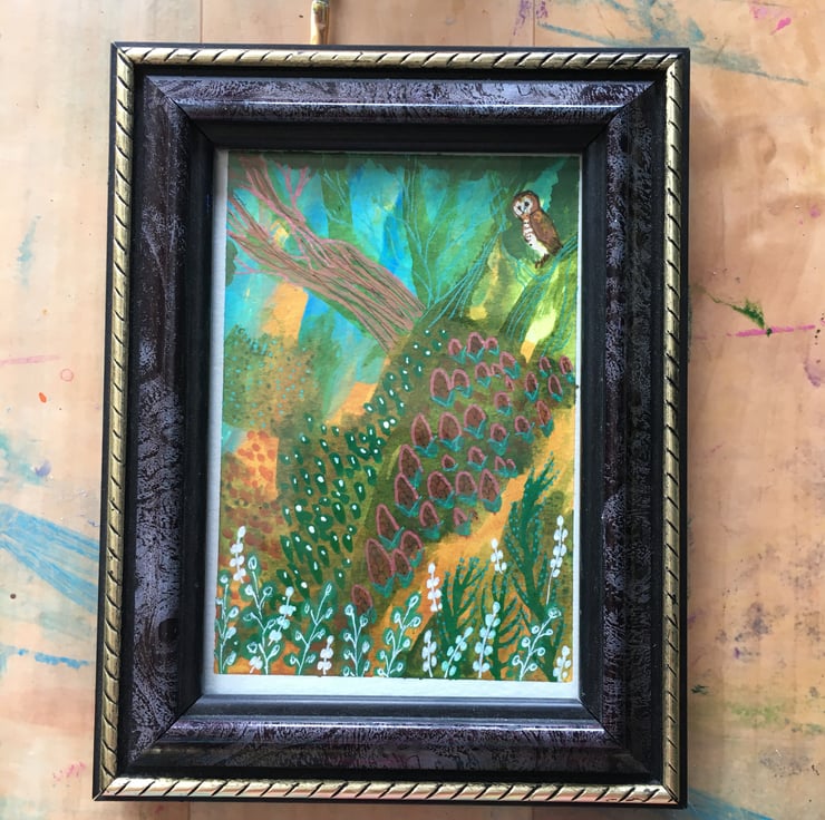 This is painted in acrylic with a watercolour background on watercolour paper. It has an owl in a colourful landscape in a whimsical style. It measures 12.5cm x 9cm approx and will fit a shop bought frame of suitable size. The frame in the photo is not for sale. It will be sent, post free to UK destinations, in a cello bag and sturdy envelope.