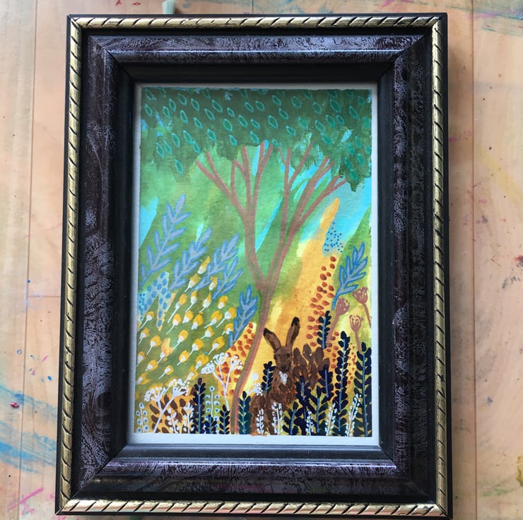 This is painted on watercolour paper using acrylic on a watercolour background, showing a hare with a colourful landscape. It measures 12.5cm x 9cm and fits a shop bought frame (frame in photo not for sale) so you can gift it or keep for yourself! It will be sent, postage free to UK destinations, packed in a cello bag and sturdy envelope.