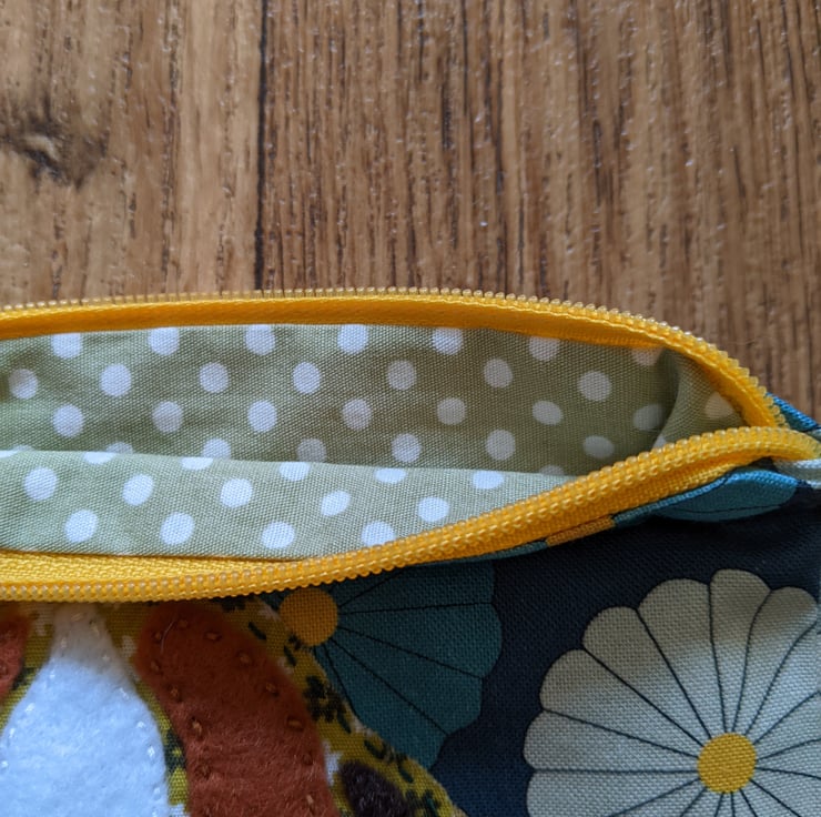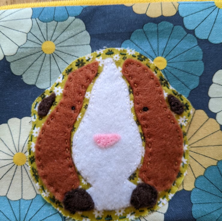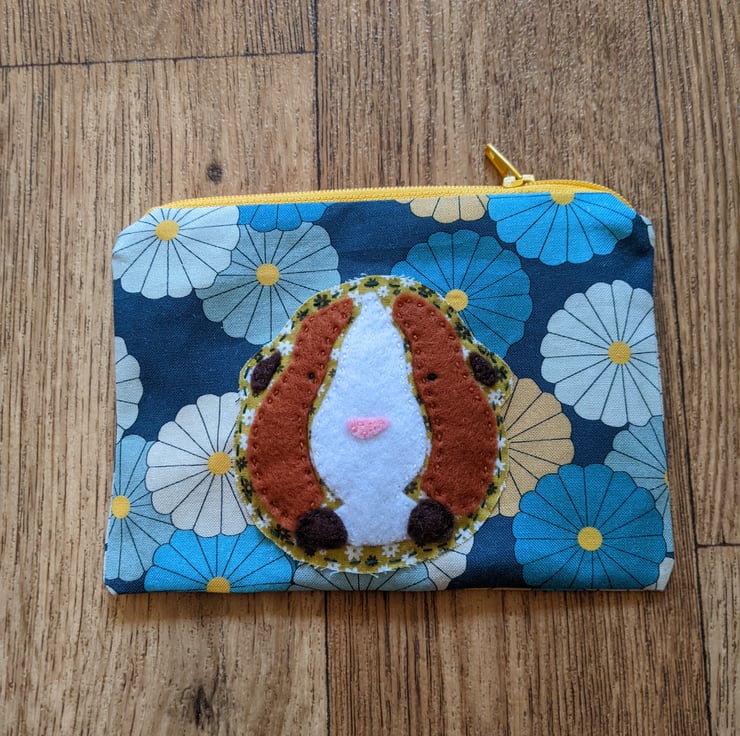 Fully-lined handmade guinea pig hand-appliquéd coin purse with yellow zip and pale green ploka-dot lining. The main fabric is a blue and green flowers, 100% cotton and the appliqué guinea pig is backed with a slightly thicker green floral cotton with brown and white felt overlays hand stitched in place.