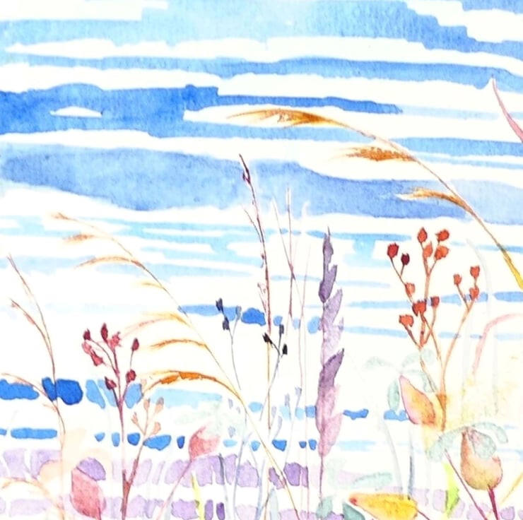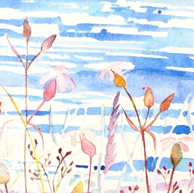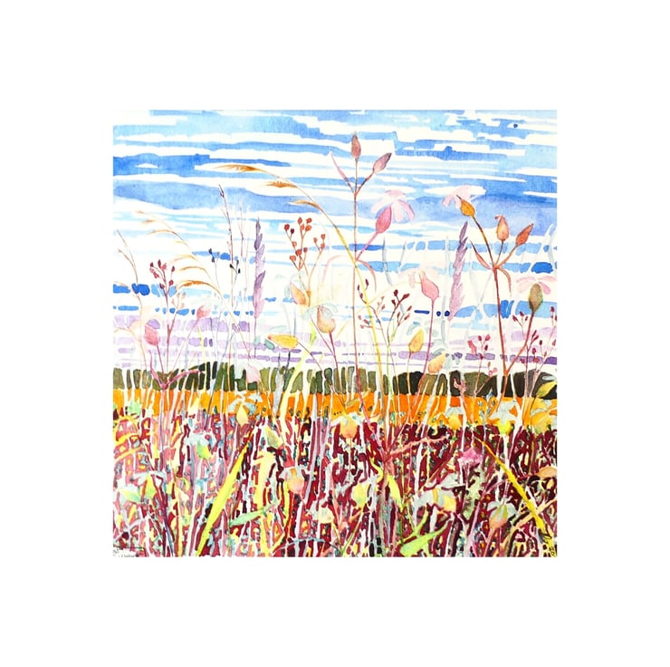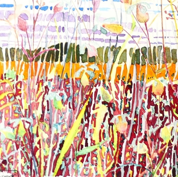 This small square watercolour is part of a series of fenland studies exploring the detail and diversity of the fenland landscape