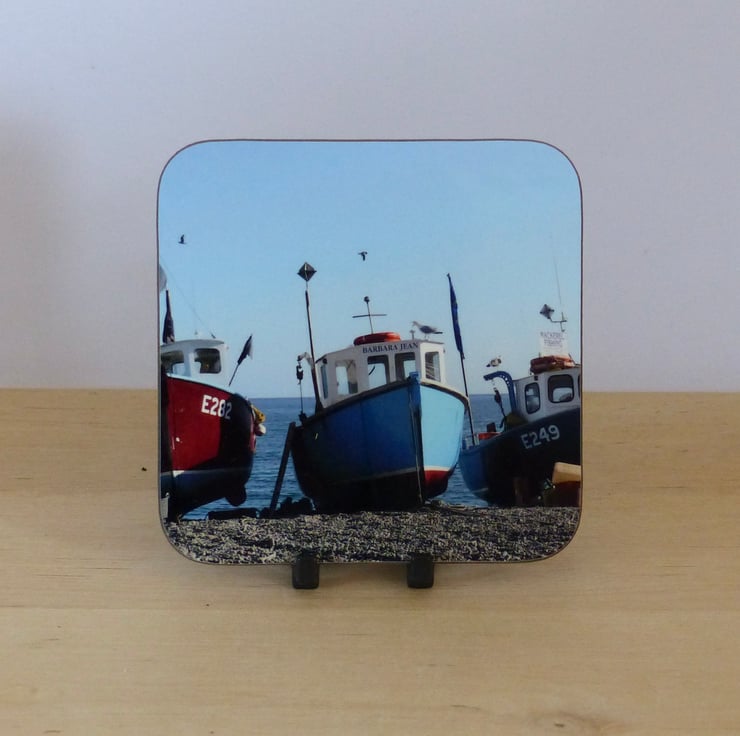 This listing is for one 9cm square x 2mm thick coaster of one of my photos taken at Beer in Devon of the fishing boats on the beach. It has rounded corners, a glossy finish and a plain brown back which should not scratch your surfaces. It will be packed and sent by Royal Mail to arrive safely.