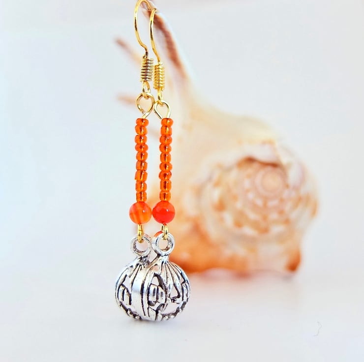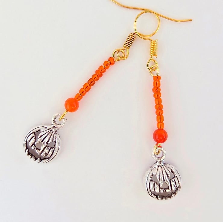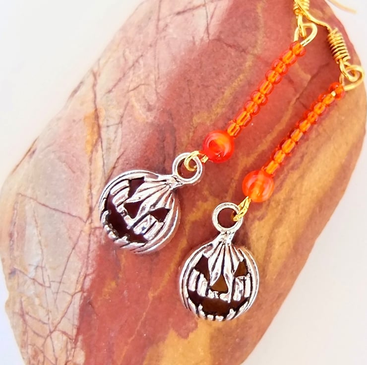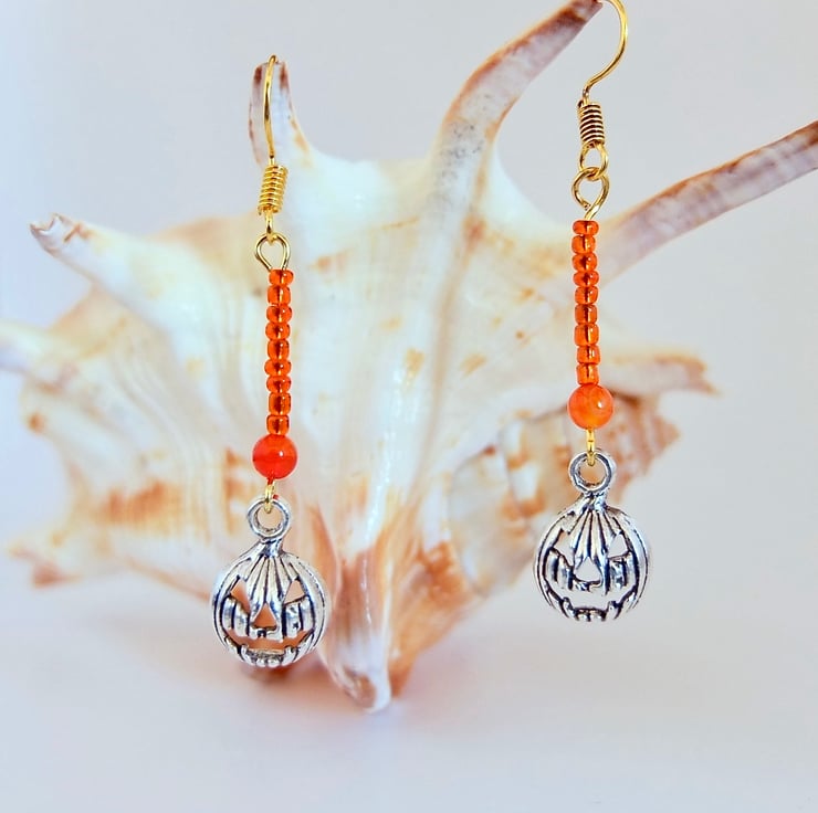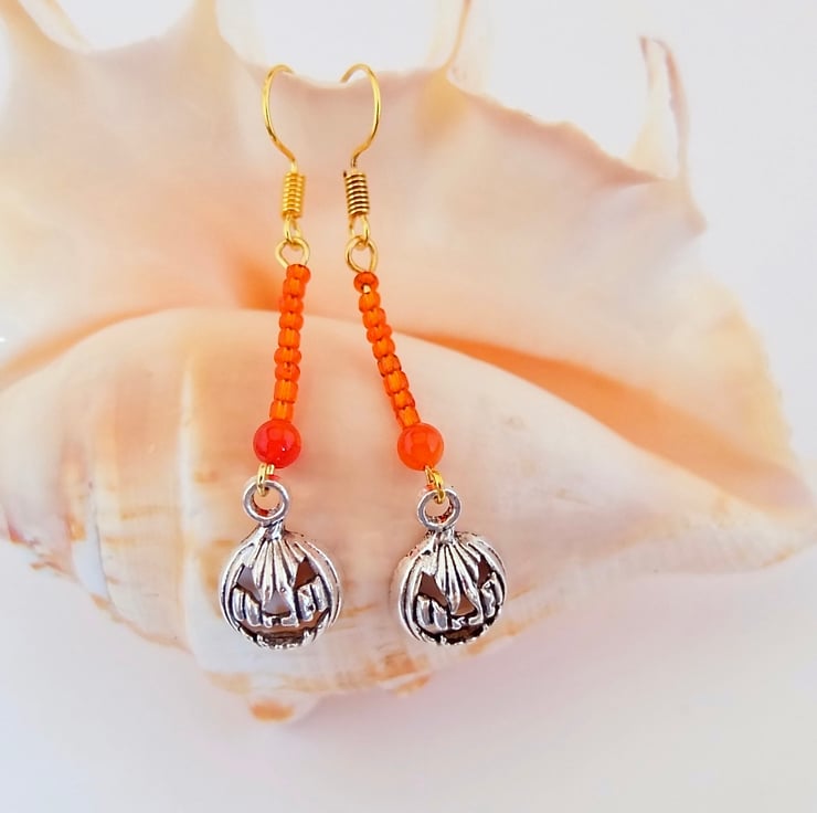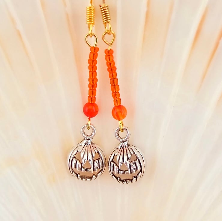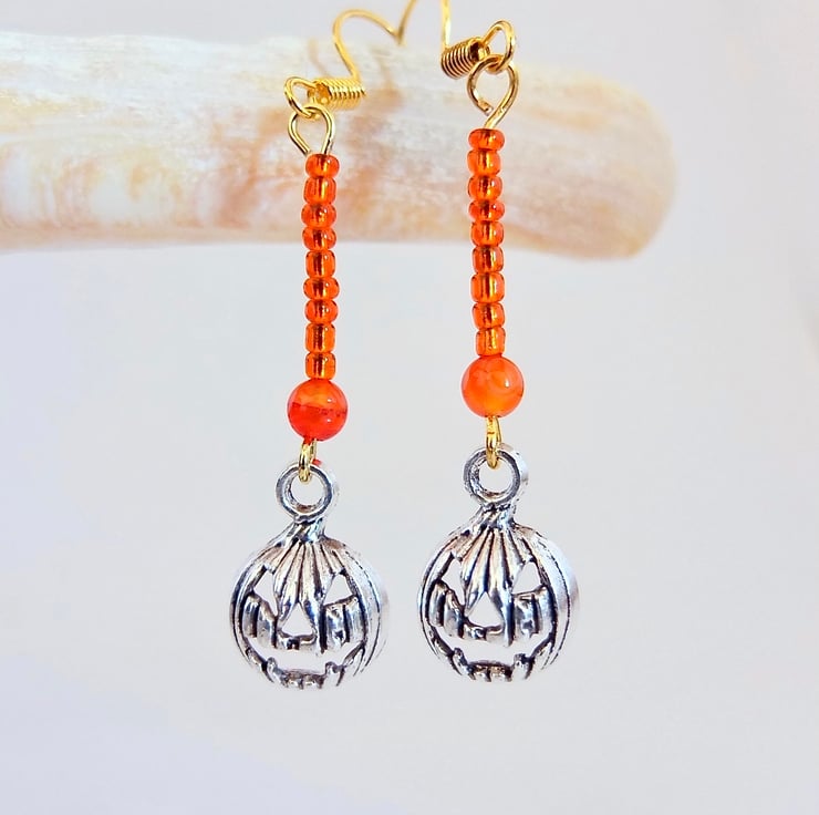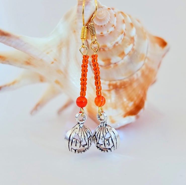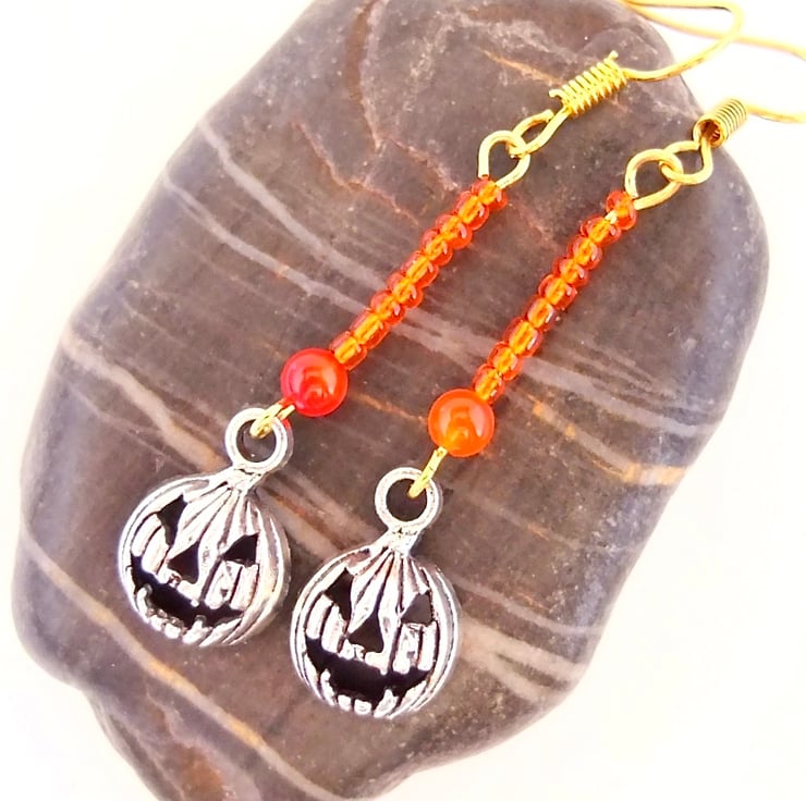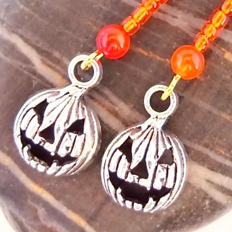 A 4mm orange Agate bead, a row of 9 orange glass seed beads and a Tibetan pumpkin charm with a scary face, in an antique silver finish.