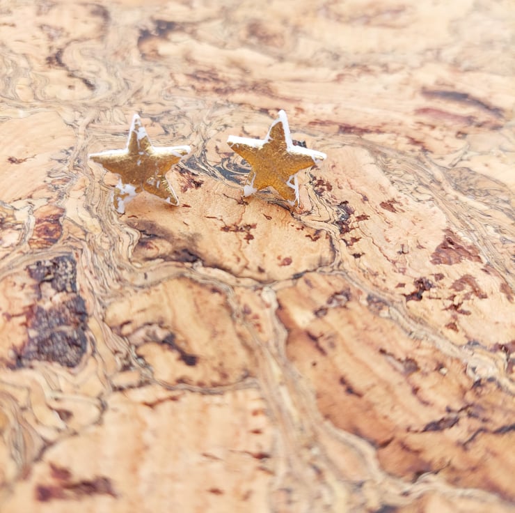 These earrings are a white polymer clay star covered with a stunning gold leaf and backed onto solid 925 sterling silver. comfortable lightweight and hypoallergic earrings.
