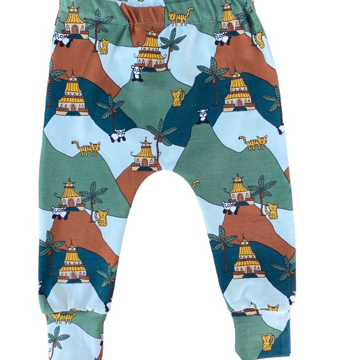Comfy, Cuffed stretchy Organic Cotton (with Lycra) leggings in a fabulous temple and mountain design with pandas and tigers