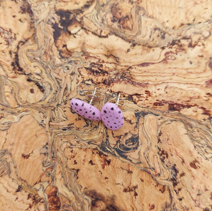 these earrings are inspired by the well loved mini egg chocolates with a pale pink background and tiny black polka dots.