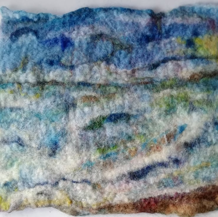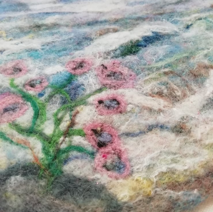 This lovely view of ocean waves and wild sea pinks growing in the rocks, has been made by wet felting. Needle felting later adding sea pinks and detail in the waves.