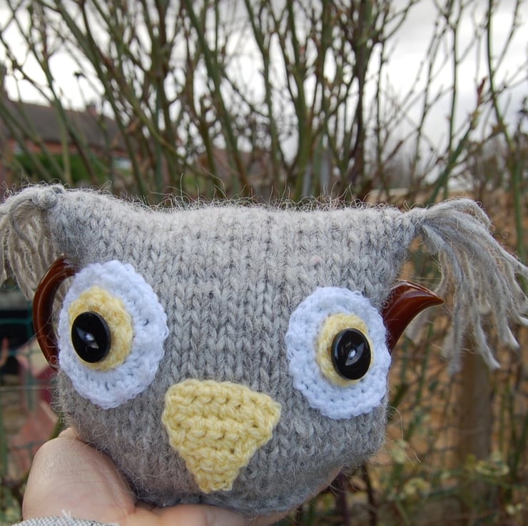 Knitted using fluffy chunky grey wool yarn. Crochet and button eyes.