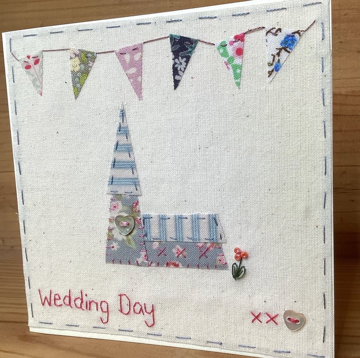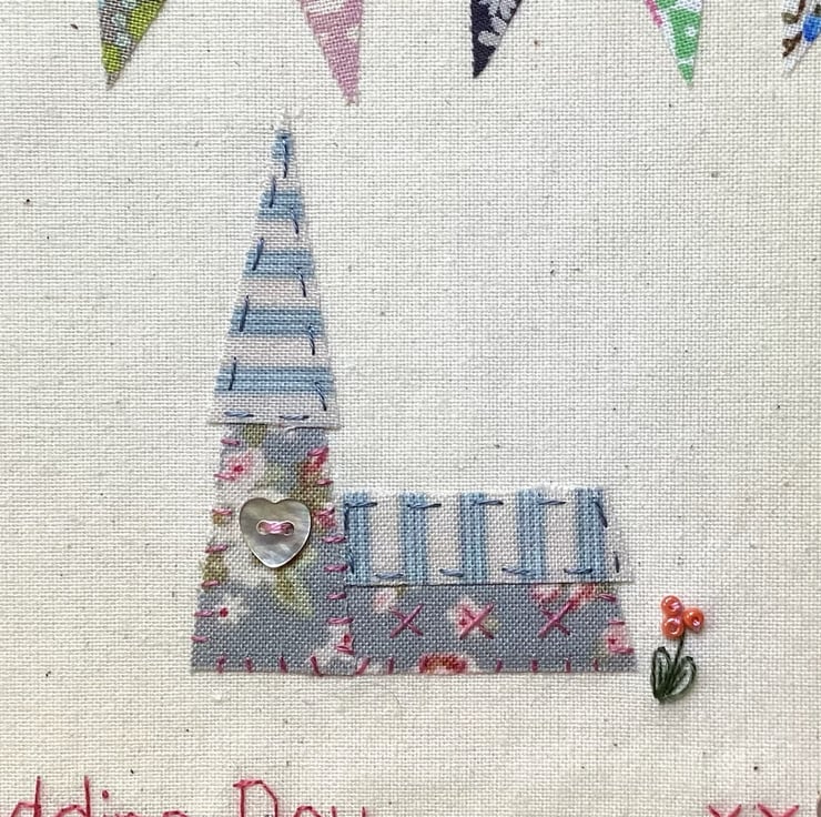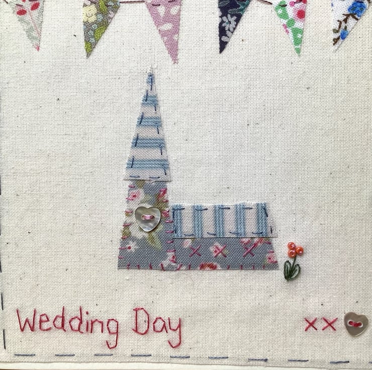 This little fabric wedding day card has been hand stitched with freehand embroidery. A little fabric church with pretty bunting is made with co-ordinating fabrics and embellished with beads and thread work. It is stitched onto a calico background and backed onto cream card with matching envelope and measures 12.5 x 12.5cm. It is left blank inside for your own message. All of my cards are carefully wrapped in tissue paper and sent out within a day of purchase.