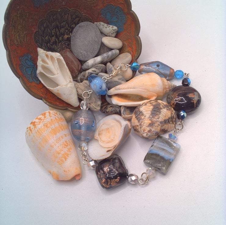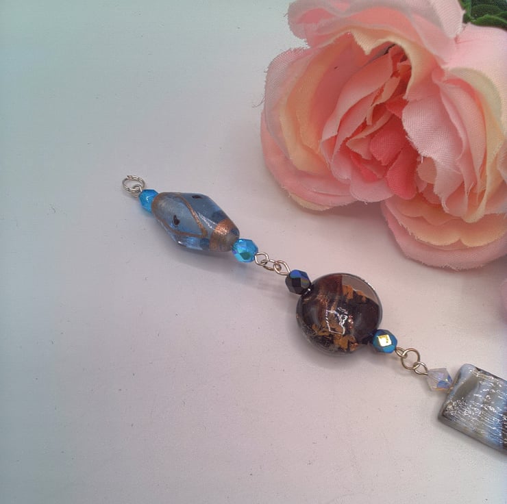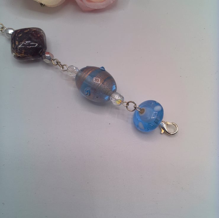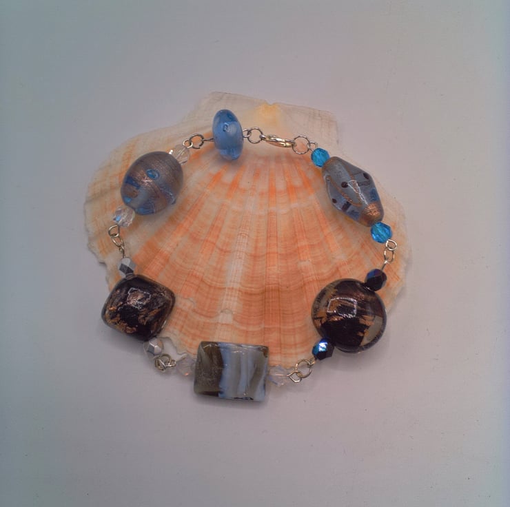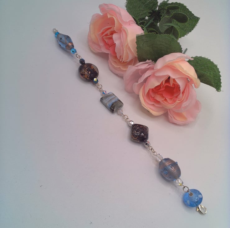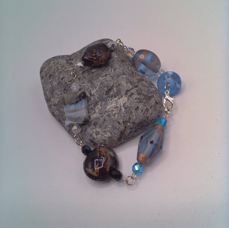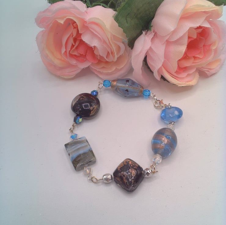 This very pretty pale blue and black lampwork bead bracelet would look great with any outfit that you wear everyday for work or for a casual party or evening out. It would also make an ideal gift for a special lady for a birthday or anniversary, or as a lovely treat for yourself. The bracelet is made using a 25 mm x 15 mm elongated puffed pale blue glass lampwork barrel bead, a 20 mm black & gold round bead, a 20 15 mm rectangular blue, white & black glass bead, a 20 x 20 mm black & gold diamond shaped bead, a 20 x 15 mm black & pale blue puffed barrel lampwork bead and an 18 x 8 mm pale blue and white lampwork saucer shaped bead