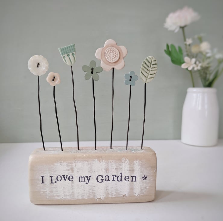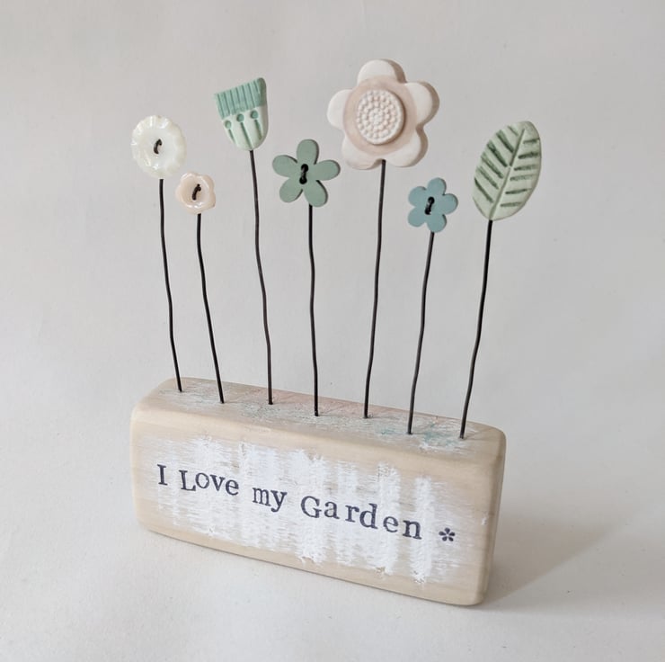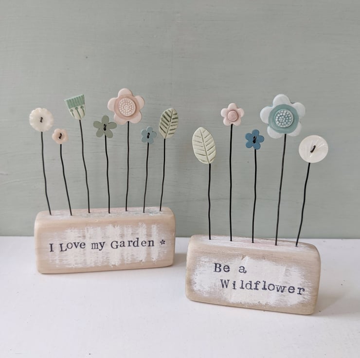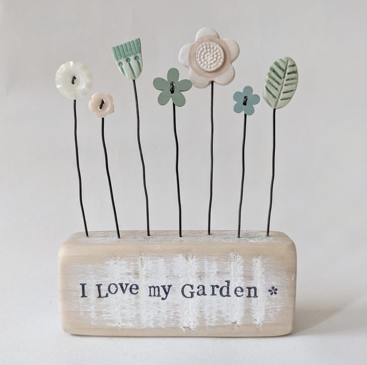 Clay and button flowers grow in a row in this little garden. They stand on their wire stalks in a painted wooden block.