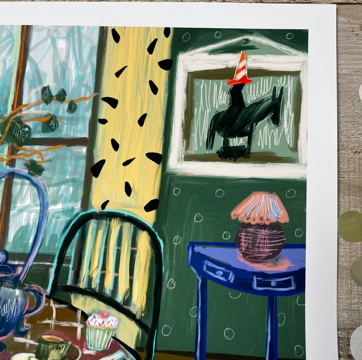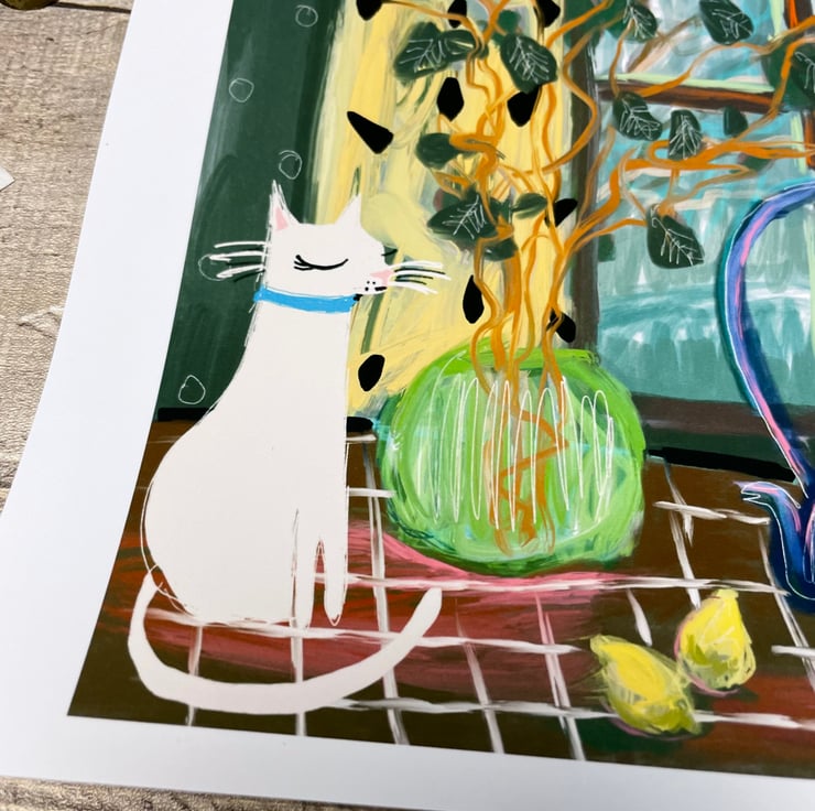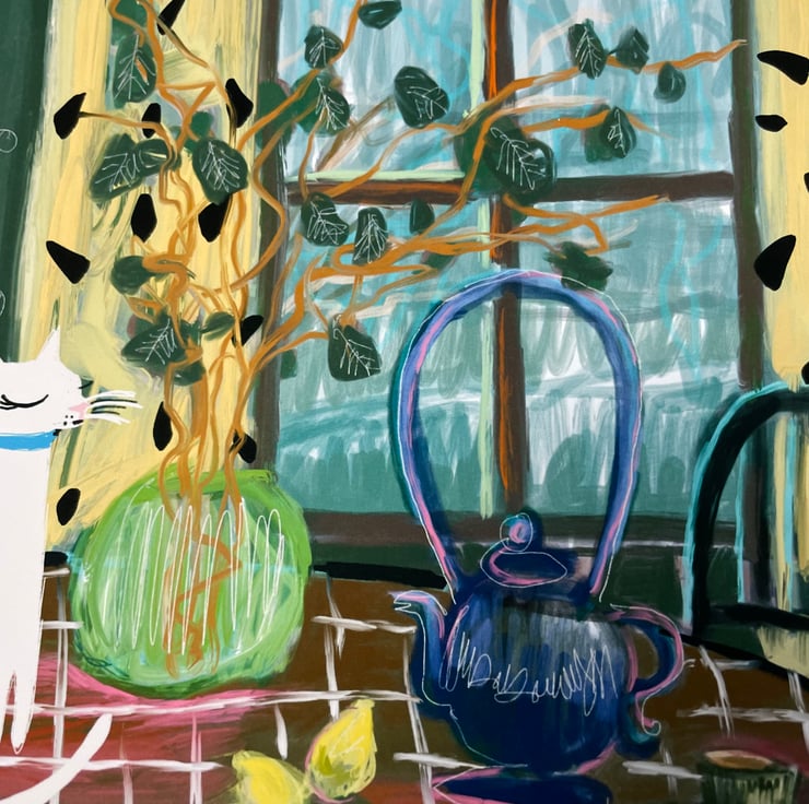 Still Life Art Print Entitled ‘White Cat Blue Teapot & Cone’ art print by Beatrice Ajayi.