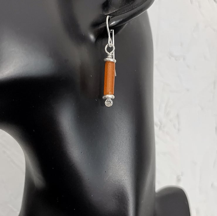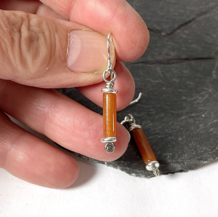 This pair of earrings have red aventurine tubes sandwiched between silver disc beads and threaded on my handmade head pins.