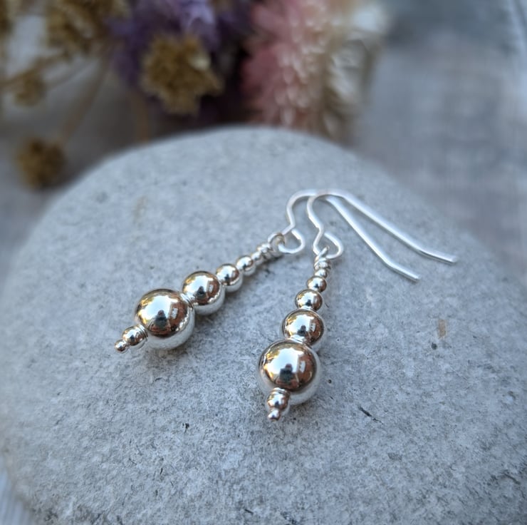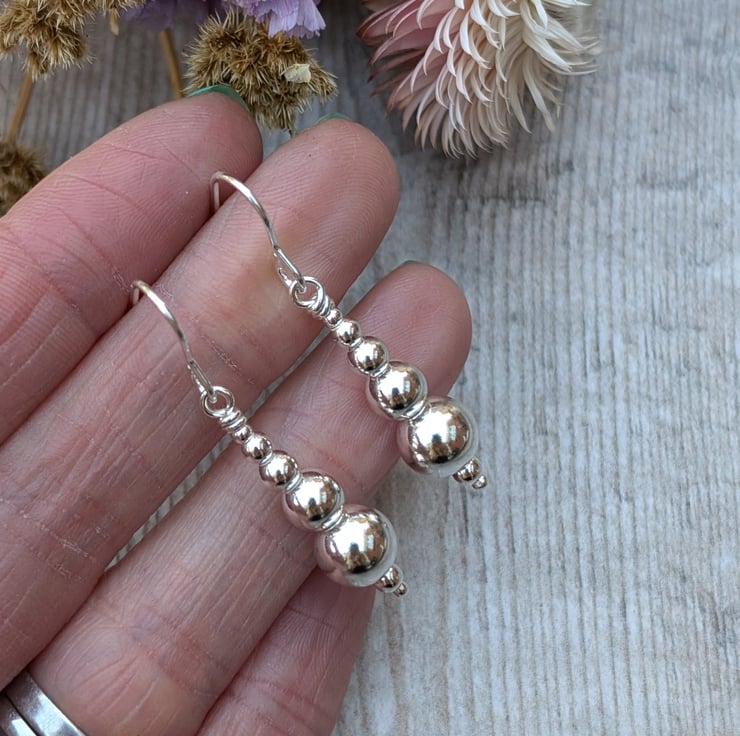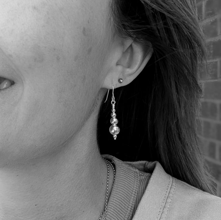 These handmade beaded drop earrings are crafted from sterling silver, featuring a delicate arrangement of polished silver beads in a graduated design. The combination of smooth, reflective surfaces and elegant proportions creates a refined yet versatile look.