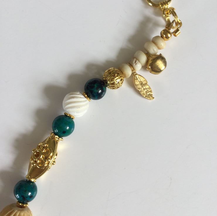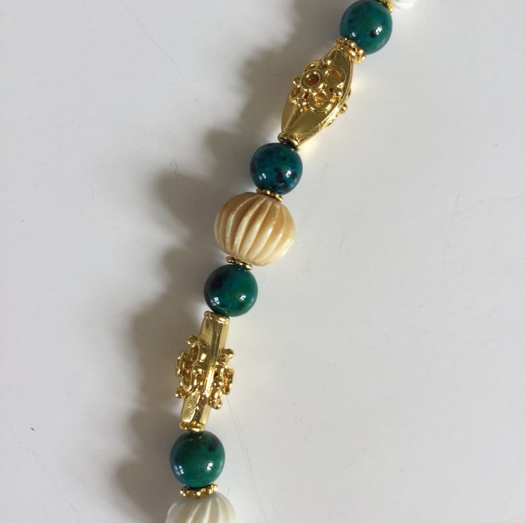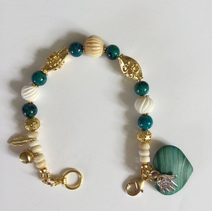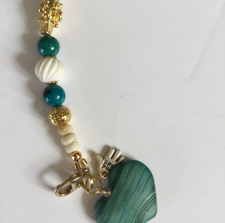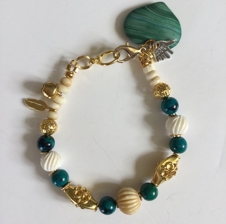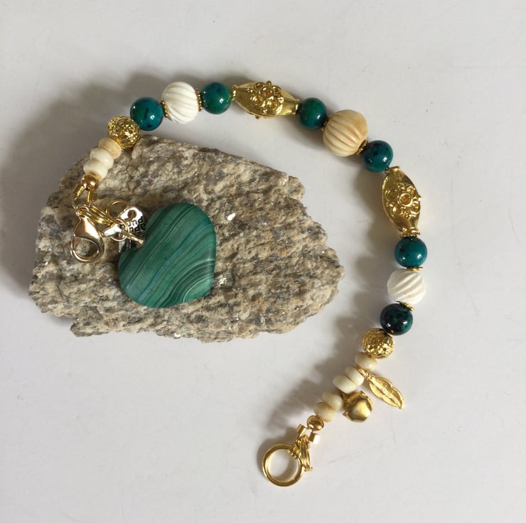 Beaded bracelet featuring beautiful green malachite, white carved bone and decorative gold plated oval beads. It is completed with a green malachite heart charm.