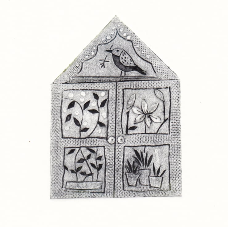 Framed Collagraph print of a little glass house printed using a warm black ink with gold painted handles. The little picture is complimented in a blue and white paisley patterned frame.