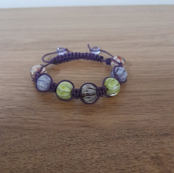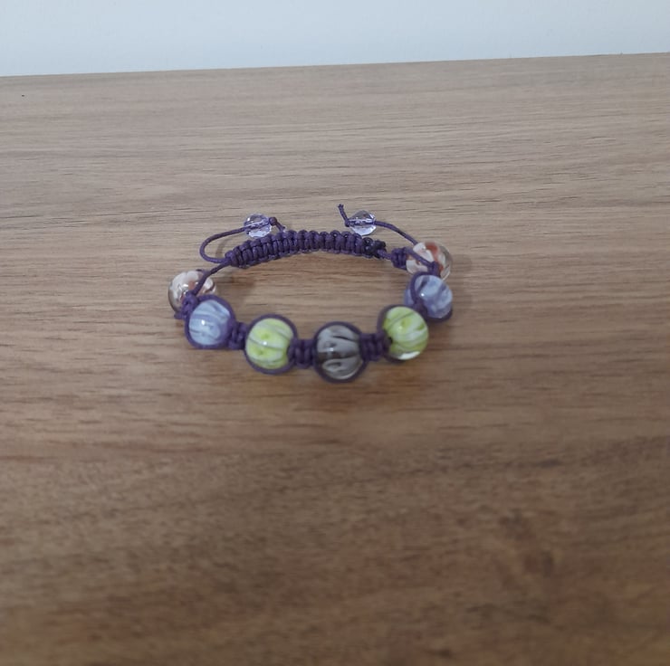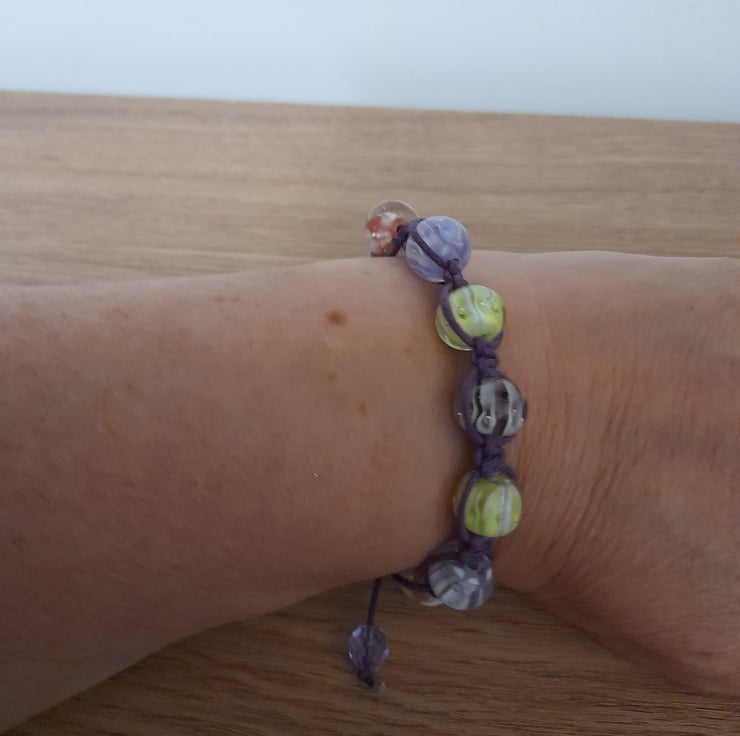THIS EASY TO WEAR HANDMADE MACRAME DESIGN BRACELET HAS BEEN DESIGNED AND HANDMADE BY MYSELF, AND HAS BEEN MADE WITH PURPLE WAXED CORD AND ROUND GLASS BEADS IN LOVELY SHADES OF PURPLE, LIME GREEN AND SHADES OF PINK WITH WHITE LINE PATTERN WITHIN THE BEADS, THE WAX CORD MACRAME WOVEN AROUND THE BEADS AND FINISHED WITH A SLIP CLOSURE AND FINISHED WITH FACETED GLASS BEADS.
