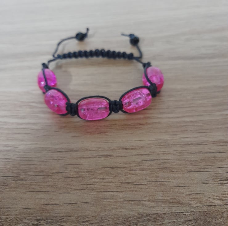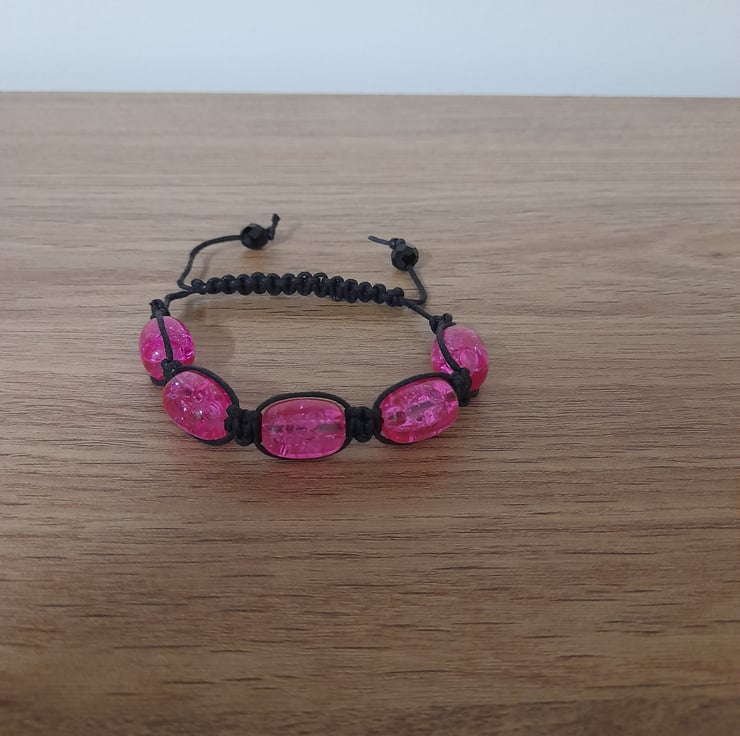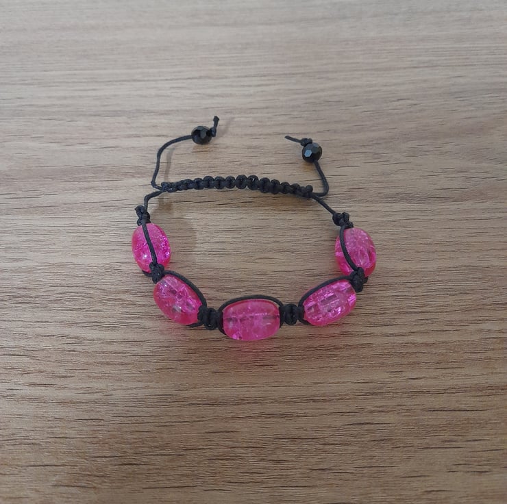 THIS EASY TO WEAR HANDMADE MACRAME DESIGN BRACELET HAS BEEN DESIGNED AND HANDMADE BY MYSELF, AND HAS BEEN MADE WITH OVAL BRIGHT PINK CRACKLE GLASS BEADS AND BLACK WAXED CORD. THE WAX CORD HAS BEEN MACRAME WOVEN AROUND THE BEADS AND FINISHED WITH A MACRAME SLIP CLOSURE AND FACETED BLACK GLASS BEADS.
