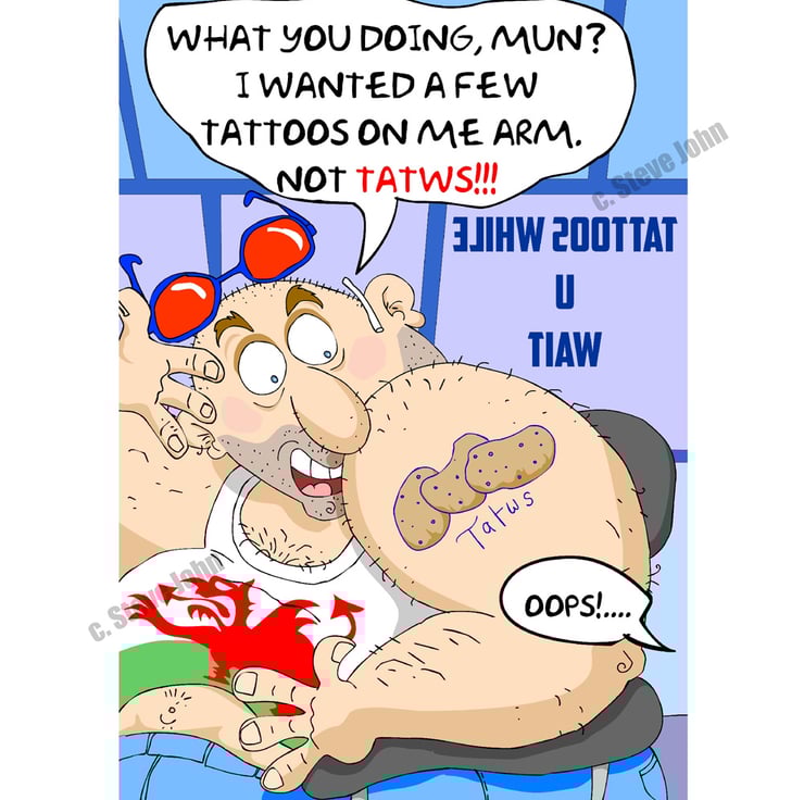 For non Welsh speakers, Tatws is Welsh for potatoes. He went in for a few tattoos, but came out wearing a few tatws (potatoes) on his arm!