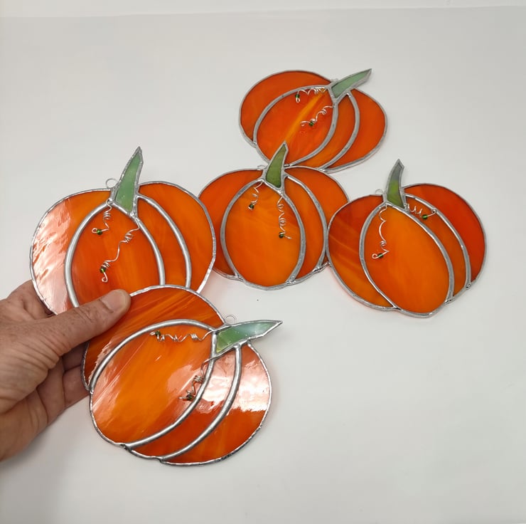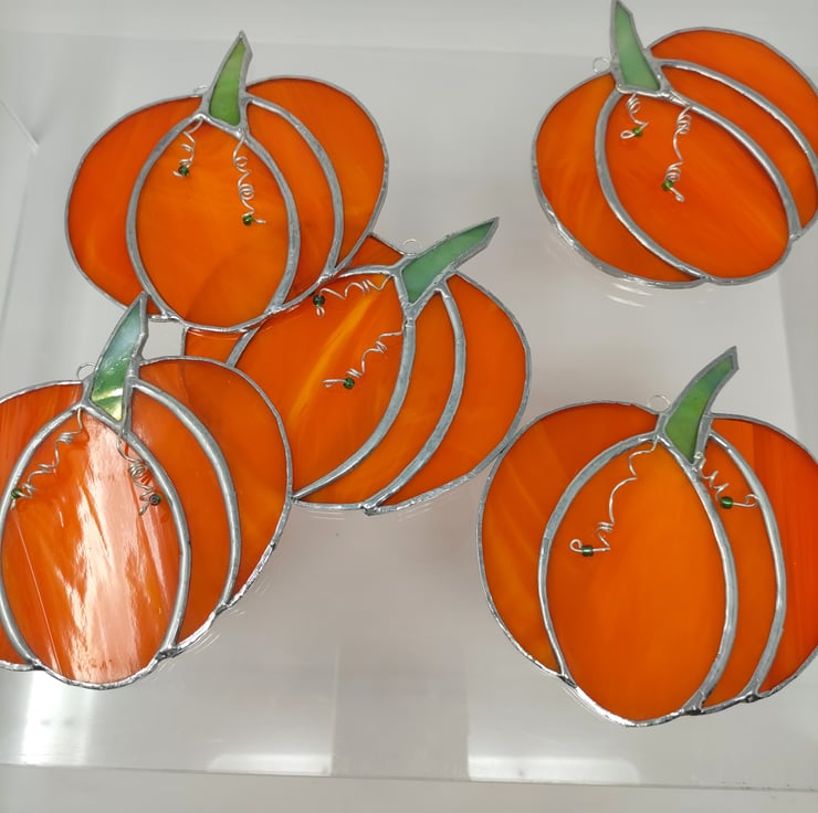 These pumpkins are made with 4 punchy orange and white wispy pieces of glass. The orange glass has different depths of colour and transparency.