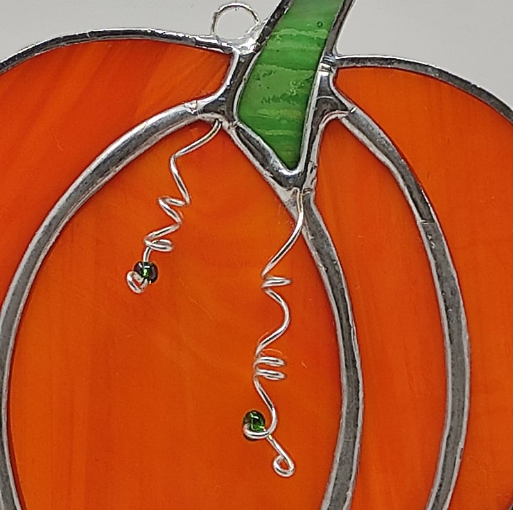 The stalk is cut with pale green iridescent glass. Two spiral coiled tendrils have been added, made from silver coloured wire, each with a green glass bead for detail.